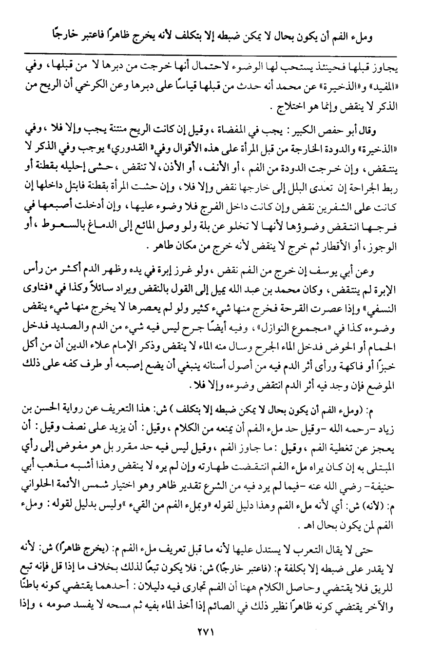 م: (وملء الفم أن يكون بحال لا يمكن ضبطه إلا بتكلف) ش: هذا التعريف عن رواية الحسن بن زياد - رَحِمَهُ اللَّهُ - وقيل حد ملء الفم أن يمنعه من الكلام، وقيل: أن يزيد على نصف وقيل: أن يعجز عن تغطية الفم، وقيل: ما جاوز الفم، وقيل ليس فيه حد مقرر بل هو مفوض إلى رأي المبتلى به إن كان يراه ملء الفم انتقضت طهارته وإن لم يره لا ينقض وهذا أشبه مذهب أبي حنيفة - رَضِيَ اللَّهُ عَنْهُ - فيما لم يرد فيه من الشرع تقدير ظاهر وهو اختيار شمس الأئمة الحلواني م: (لأنه) ش: أي لأنه ملء الفم وهذا دليل لقوله "وبملء الفم من القيء" وليس بدليل لقوله: وملء الفم لمن يكون بحال اه.