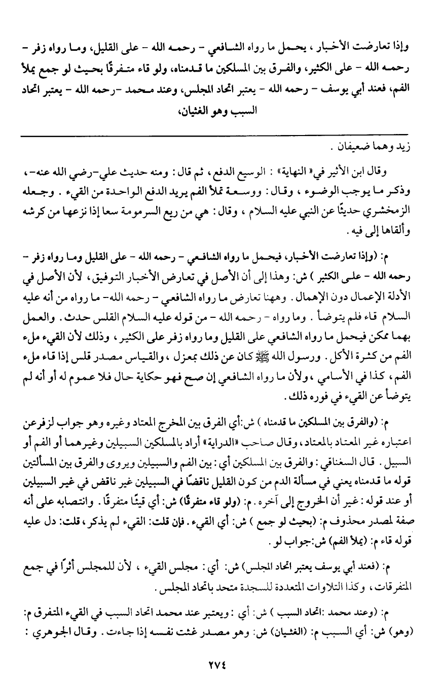 وإذا تعارضت الأخبار، يحمل ما رواه الشافعي - رَحِمَهُ اللَّهُ - على القليل، وما رواه زفر - رَحِمَهُ اللَّهُ - على الكثير، والفرق بين المسلكين ما قدمناه، ولو قاء متفرقا بحيث لو جمع يملأ الفم، فعند أبي يوسف - رَحِمَهُ اللَّهُ - يعتبر اتحاد المجلس، وعند محمد - رَحِمَهُ اللَّهُ - يعتبر اتحاد السبب وهو الغثيان،