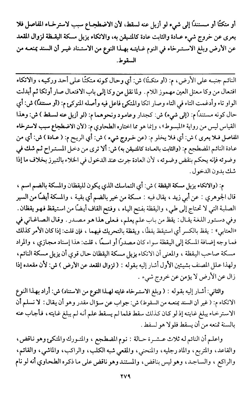 أو متكئا أو مستندا إلى شيء لو أزيل عنه لسقط، لأن الاضطجاع سبب لاسترخاء المفاصل فلا يعرى عن خروج شيء عادة والثابت عادة كالمتيقن به،