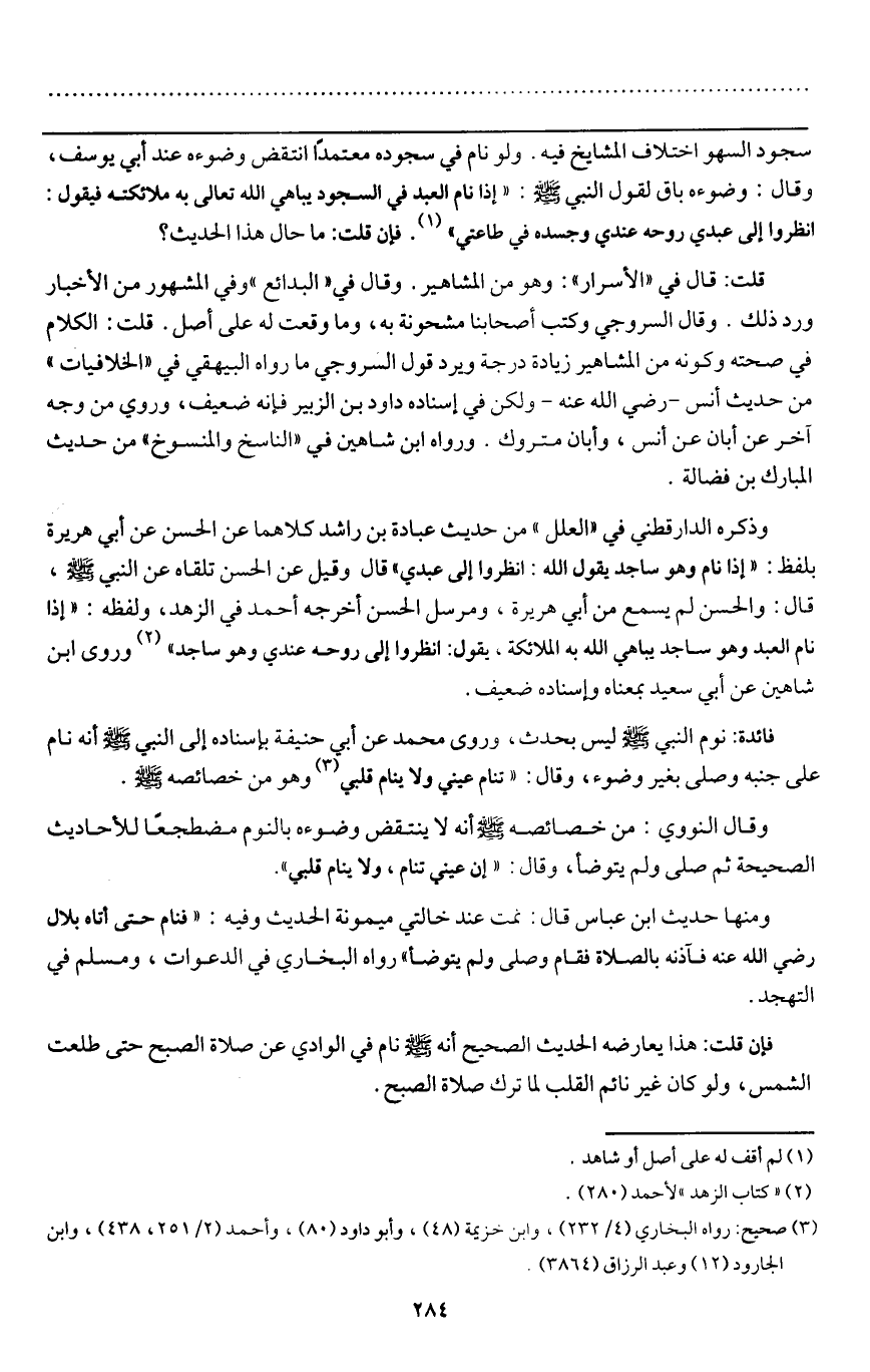 وقال النووي: من خصائصه - صَلَّى اللَّهُ عَلَيْهِ وَسَلَّمَ - أنه لا ينتقض وضوؤه بالنوم مضطجعا للأحاديث الصحيحة ثم صلى ولم يتوضأ، وقال: «إن عيني تنام، ولا ينام قلبي»