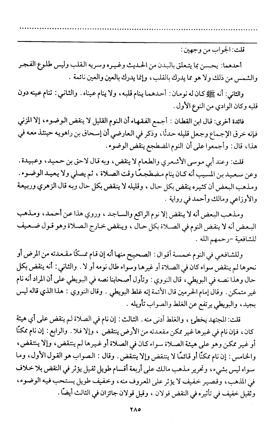 وللشافعي في النوم خمسة أقوال: الصحيح منها أنه إن قام ممسكا مقعدته من الأرض أو نحوها لم ينقض سواء كان في الصلاة أو غيرها وسواء طال نومه أو لا. والثاني: أنه ينقض بكل حال وهذا نصه في البويطي، قال النووي: وتأول أصحابنا نصه في البويطي على أن المراد أنه نام غير متمكن. وقال إمام الحرمين قال الأئمة إنه غلط البويطي. وقال النووي: هذا الذي قاله ليس بجيد، والبويطي يرتفع عن الغلط والصواب تأويله.