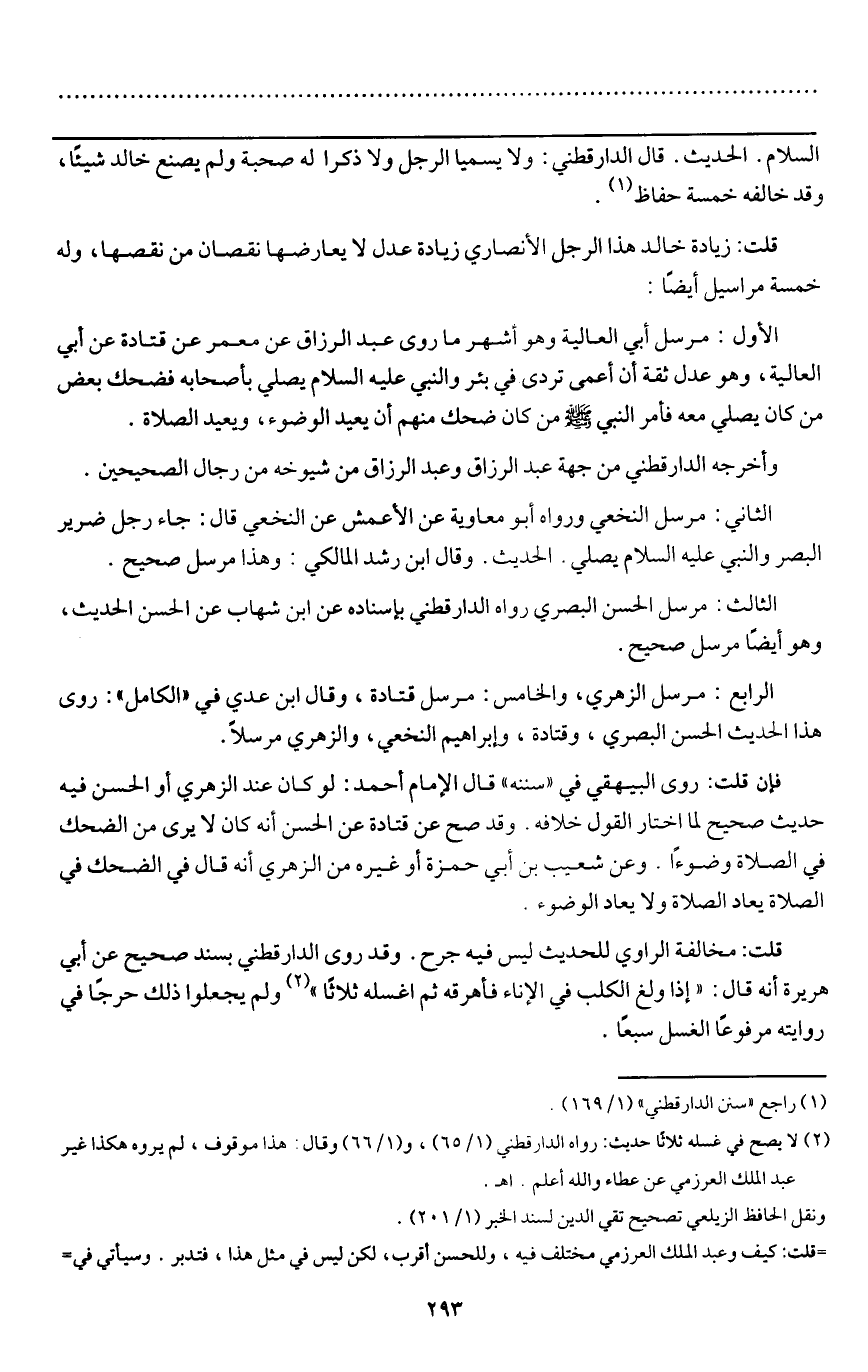 ـــــــــــــــــــــــــــــQالسلام. الحديث. قال الدارقطني: ولا يسميا الرجل ولا ذكرا له صحبة ولم يصنع خالد شيئا، وقد خالفه خمسة حفاظ.