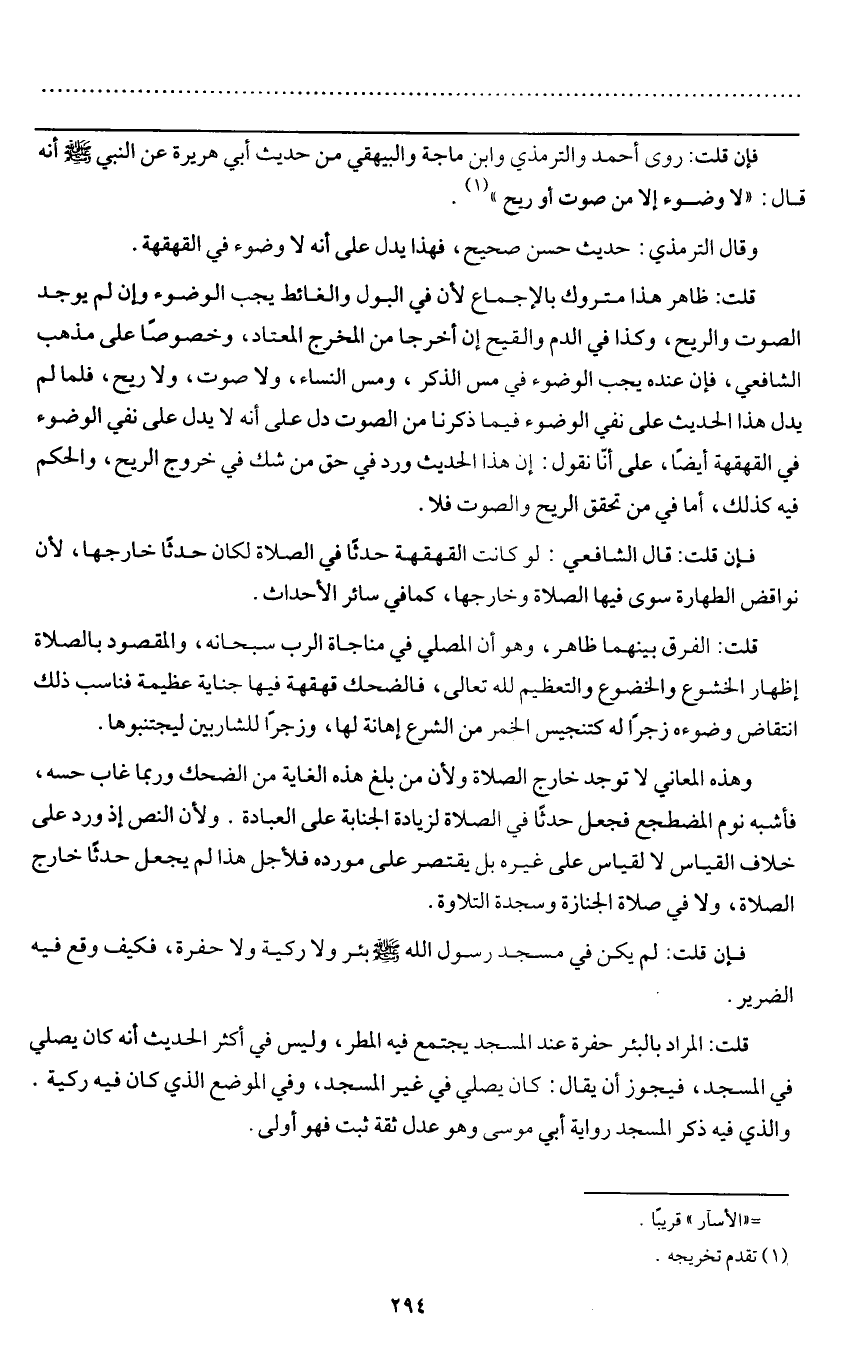 ـــــــــــــــــــــــــــــQفإن قلت: روى أحمد والترمذي وابن ماجه والبيهقي من حديث أبي هريرة عن النبي - صَلَّى اللَّهُ عَلَيْهِ وَسَلَّمَ - أنه قال: «لا وضوء إلا من صوت أو ريح» .