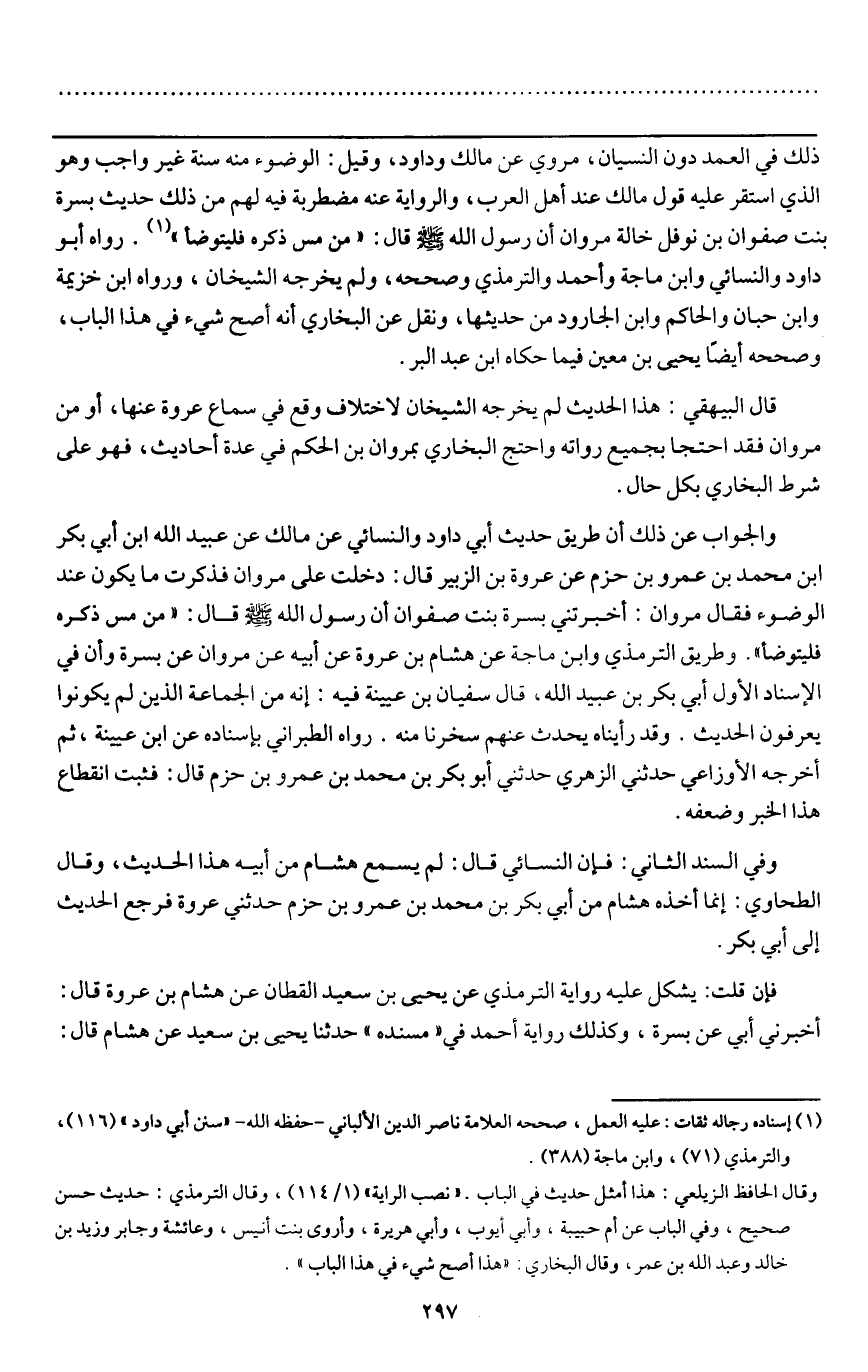 والجواب عن ذلك أن طريق حديث أبي داود والنسائي عن مالك عن عبيد الله بن أبي بكر بن محمد بن عمرو بن حزم عن عروة بن الزبير قال: دخلت على مروان فذكرت ما يكون عند الوضوء فقال مروان: أخبرتني بسرة بنت صفوان أن رسول الله - صَلَّى اللَّهُ عَلَيْهِ وَسَلَّمَ - قال: «من مس ذكره فليتوضأ» . وطريق الترمذي وابن ماجه عن هشام بن عروة عن أبيه عن مروان عن بسرة وأن في الإسناد الأول أبي بكر بن عبيد الله، قال سفيان بن عيينة فيه: إنه من الجماعة الذين لم يكونوا يعرفون الحديث. وقد رأيناه يحدث عنهم سخرنا منه. رواه الطبراني بإسناده عن ابن عيينة، ثم أخرجه الأوزاعي حدثني الزهري حدثني أبو بكر بن محمد بن عمرو بن حزم قال: فثبت انقطاع هذا الخبر وضعفه.