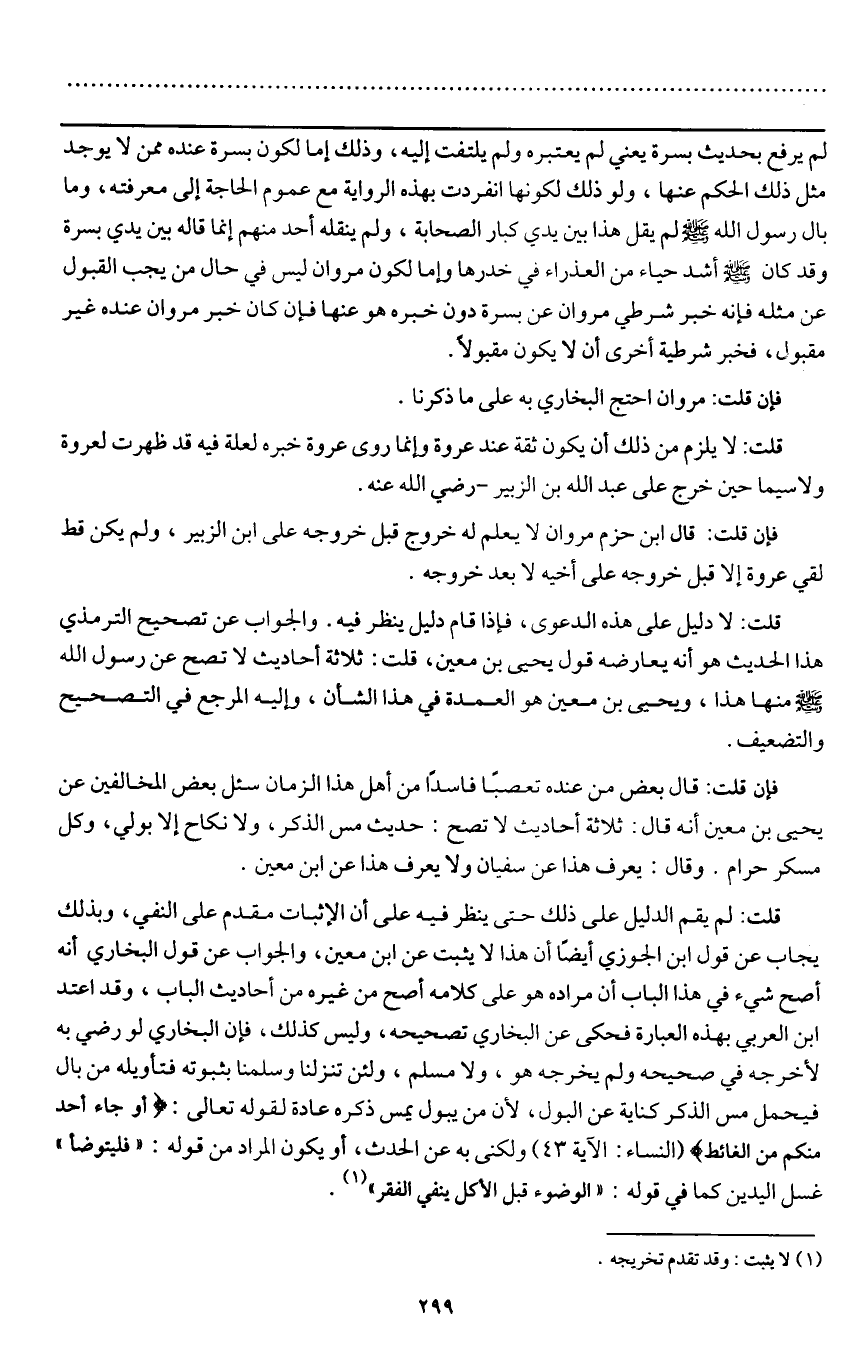 قلت: لم يقم الدليل على ذلك حتى ينظر فيه على أن الإثبات مقدم على النفي، وبذلك يجاب عن قول ابن الجوزي أيضا أن هذا لا يثبت عن ابن معين، والجواب عن قول البخاري أنه أصح شيء في هذا الباب، أن مراده هو على كلامه أصح من غيره من أحاديث الباب، وقد اعتد ابن العربي بهذه العبارة فحكى عن البخاري تصحيحه، وليس كذلك، فإن البخاري لو رضي به لأخرجه في صحيحه ولم يخرجه هو، ولا مسلم، ولئن تنزلنا وسلمنا بثبوته فتأويله من بال فيحمل مس الذكر كناية عن البول، لان من يبول يمس ذكره عادة لِقَوْلِهِ تَعَالَى: {أَوْ جَاءَ أَحَدٌ مِنْكُمْ مِنَ الْغَائِطِ} [النساء: 43] (النساء: الآية 43) ولكنى به عن الحدث، أو يكون المراد من قوله: "فليتوضأ" غسل اليدين كما في قوله: «الوضوء قبل الأكل ينفي الفقر» .