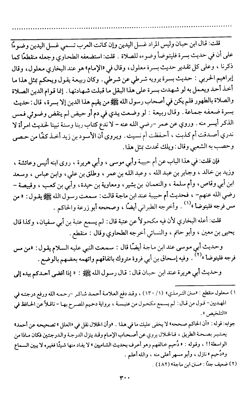 فإن قلت: في هذا الباب عن أم حبيبة وأبي موسى، وأبي هريرة، روى ابنه أنيس وعائشة، وزيد بن خالد، وجابر بن عبد الله، وعبد الله بن عمر، وطلق بن علي، وابن عباس، وسعد بن أبي وقاص، وأم سلمة، والنعمان بن بشير، ومعاوية بن حيدة، وأبي بن كعب، وقبيصة - رَضِيَ اللَّهُ عَنْهُمْ -، فحديث أم حبيبة عند ابن ماجه قالت: سمعت رسول الله - صَلَّى اللَّهُ عَلَيْهِ وَسَلَّمَ - يقول: «من مس فرجه فليتوضأ» ، وأخرجه الطبراني أيضا، وصححه أبو زرعة والحاكم.