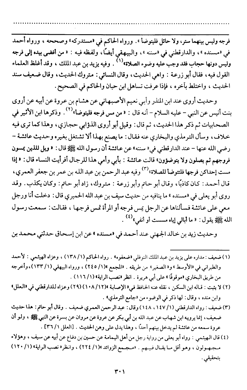 ـــــــــــــــــــــــــــــQفرجه وليس بينهما ستر، ولا حائل فليتوضأ» . ورواه الحاكم في "مستدركه " وصححه، ورواه أحمد في "مسنده "، والدارقطني في "سننه "، والبيهقي أيضا، ولفظه فيه: «من أفضى بيده إلى فرجه وليس دونها حجاب فقد وجب عليه وضوء الصلاة» . وفيه يزيد بن عبد الملك، وقد أغلظ العلماء القول فيه، فقال أبو زرعة: واهي الحديث، وقال النسائي: متروك الحديث، وقال ضعيف سند الحديث، واختلط بآخره، فإذا عرفت تساهل ابن حبان والحاكم في الصحيح.