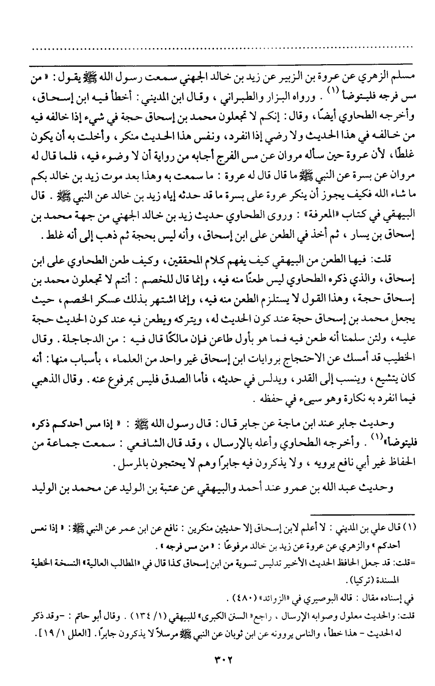 ـــــــــــــــــــــــــــــQمسلم الزهري عن عروة بن الزبير عن زيد بن خالد الجهني سمعت رسول الله - صَلَّى اللَّهُ عَلَيْهِ وَسَلَّمَ - يقول: «من مس فرجه فليتوضأ» . ورواه البزار والطبراني، وقال ابن المديني: أخطأ فيه ابن إسحاق، وأخرجه الطحاوي أيضا، وقال: إنكم لا تجعلون محمد بن إسحاق حجة في شيء إذا خالفه فيه من خالفه في هذا الحديث ولا رضي إذا انفرد، ونفس هذا الحديث منكر، وأخلت به أن يكون غلطا، لأن عروة حين سأله مروان عن مس الفرج أجابه من رواية أن لا وضوء فيه، فلما قال له مروان عن بسرة عن النبي - صَلَّى اللَّهُ عَلَيْهِ وَسَلَّمَ - ما قال قال له عروة: ما سمعت به وهذا بعد موت زيد بن خالد بكم ما شاء الله فكيف يجوز أن ينكر عروة على بسرة ما قد حدثه إياه زيد بن خالد عن النبي - صَلَّى اللَّهُ عَلَيْهِ وَسَلَّمَ -. قال البيهقي في كتاب "المعرفة ": وروى الطحاوي حديث زيد بن خالد الجهني من جهة محمد بن إسحاق بن يسار، ثم أخذ في الطعن على ابن إسحاق، وأنه ليس بحجة ثم ذهب إلى أنه غلط.