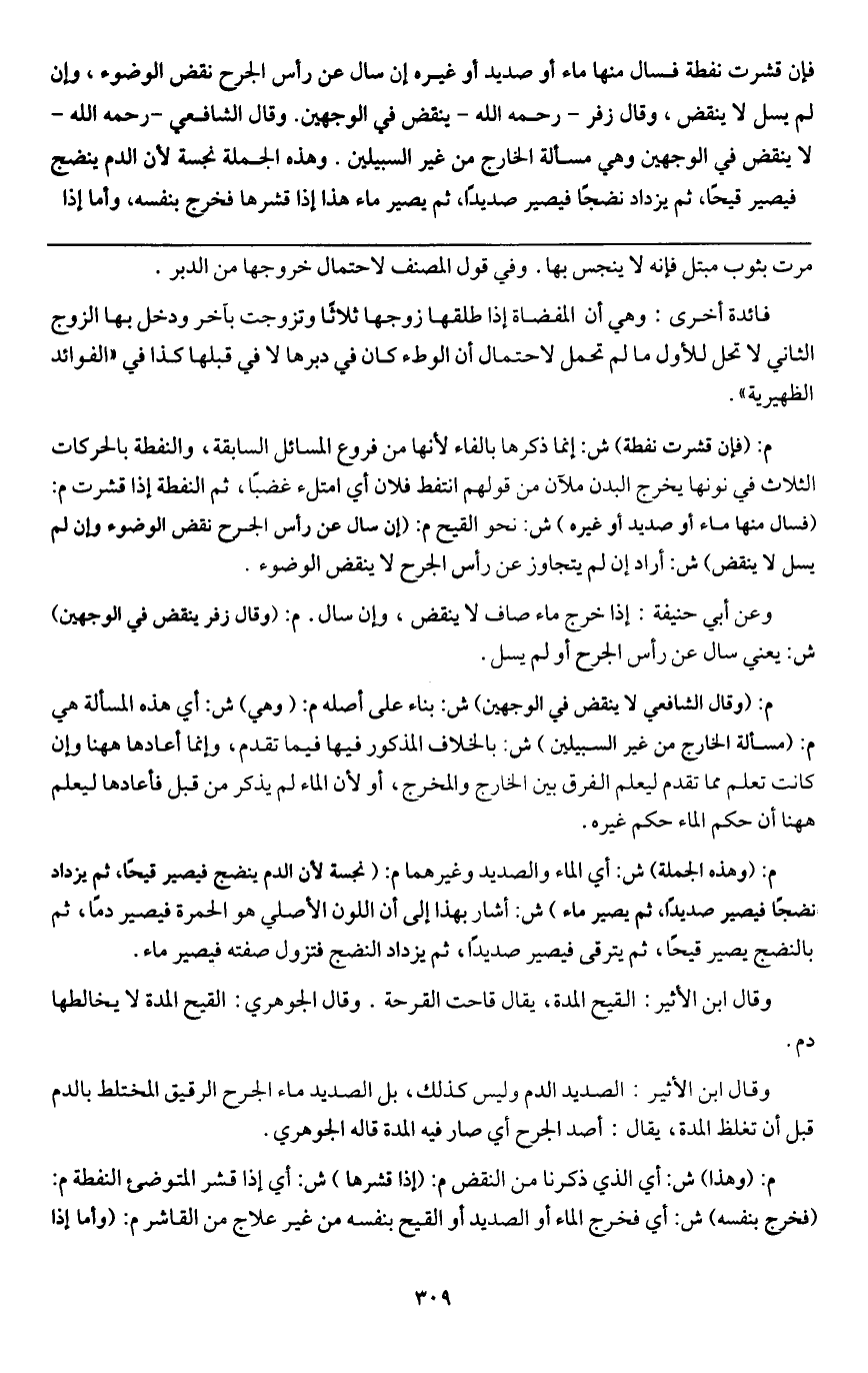 وعن أبي حنيفة: إذا خرج ماء صاف لا ينقض، وإن سال. م: (وقال زفر ينقض في الوجهين) ش: يعني سال عن رأس الجرح أو لم يسل.
