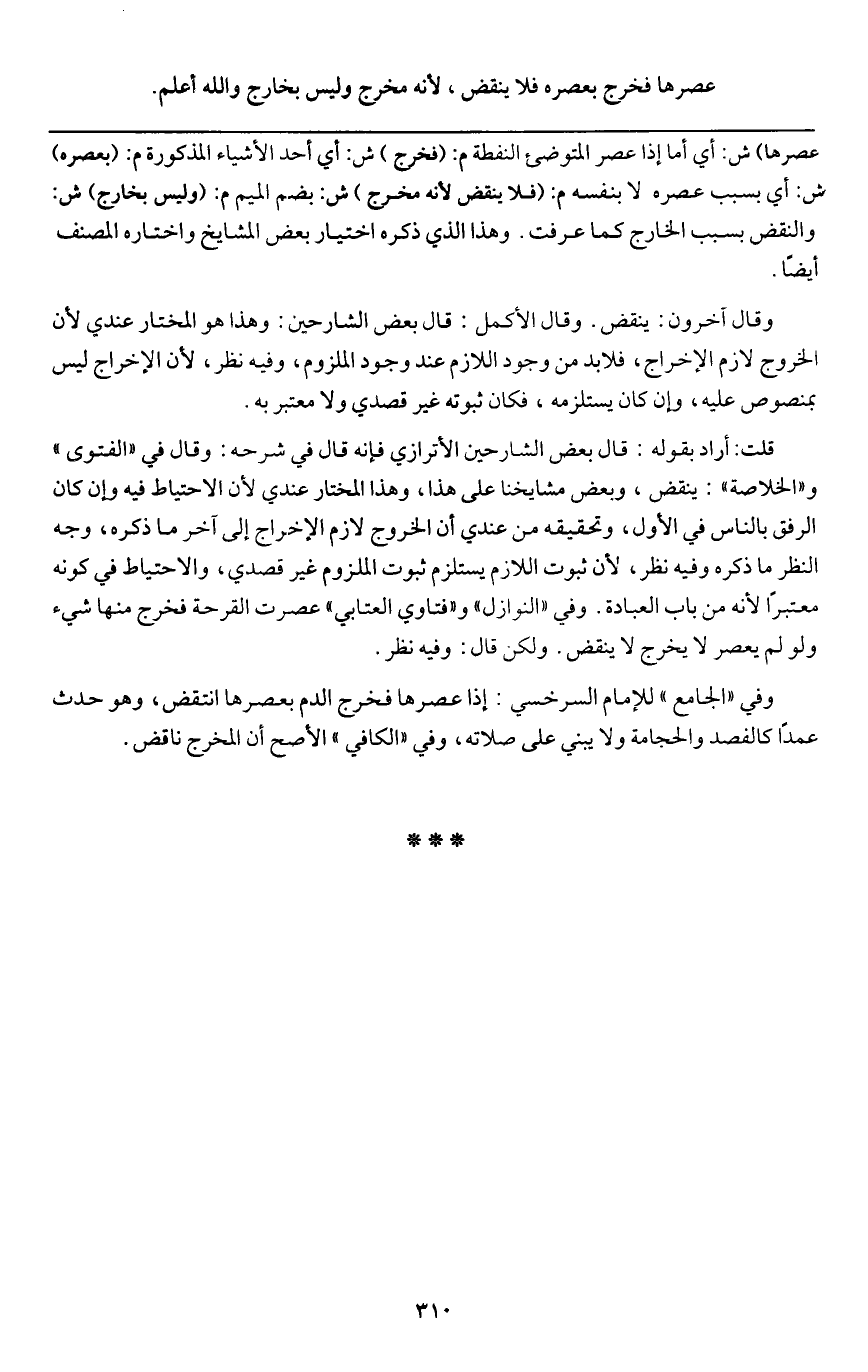 ـــــــــــــــــــــــــــــQعصرها) ش: أي أما إذا عصر المتوضئ النفطة م: (فخرج) ش: أي أحد الأشياء المذكورة م: (بعصره) ش: أي بسبب عصره لا بنفسه م: (فلا ينقض لأنه مخرج) ش: بضم الميم م: (وليس بخارج) ش: والنقض بسبب الخارج كما عرفت. وهذا الذي ذكره اختيار بعض المشايخ واختاره المصنف أيضا.
