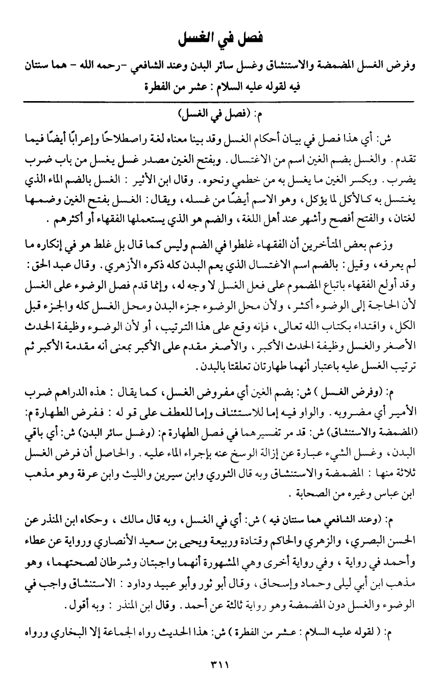 وزعم بعض المتأخرين أن الفقهاء غلطوا في الضم وليس كما قال بل غلط هو في إنكاره ما لم يعرفه، وقيل: بالضم اسم الاغتسال الذي يعم البدن كله ذكره الأزهري. وقال عبد الحق: وقد أولع الفقهاء باتباع المضموم على فعل الغسل لا وجه له، وإنما قدم فصل الوضوء على الغسل لأن الحاجة إلى الوضوء أكثر، ولأن محل الوضوء جزء البدن ومحل الغسل كله والجزء قبل الكل، واقتداء بكتاب الله تعالى، فإنه وقع على هذا الترتيب، أو لأن الوضوء وظيفة الحدث الأصغر والغسل وظيفة الحدث الأكبر، والأصغر مقدم على الأكبر بمعنى أنه مقدمة الأكبر ثم ترتيب الغسل عليه باعتبار أنهما طهارتان تعلقتا بالبدن.