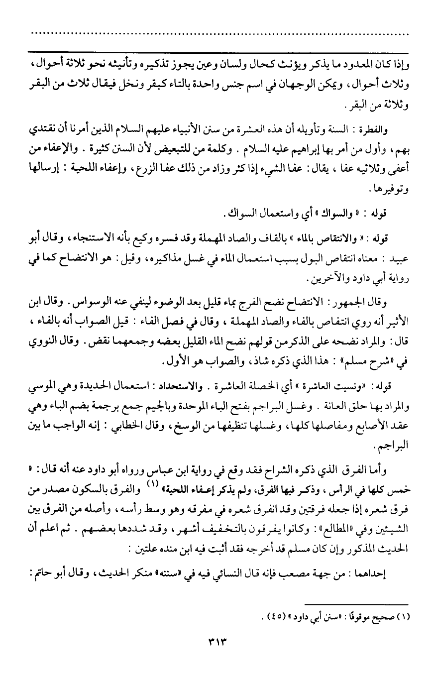 والفطرة: السنة وتأويله أن هذه العشرة من سنن الأنبياء - عَلَيْهِمْ السَّلَامُ - الذين أمرنا أن نقتدي بهم، وأول من أمر بها إبراهيم - عَلَيْهِ السَّلَامُ -. وكلمة من للتبعيض لأن السنن كثيرة. والإعفاء من أعفى وثلاثيه عفا، يقال: عفا الشيء إذا كثر وزاد من ذلك عفا الزرع، وإعفاء اللحية: إرسالها وتوفيرها.