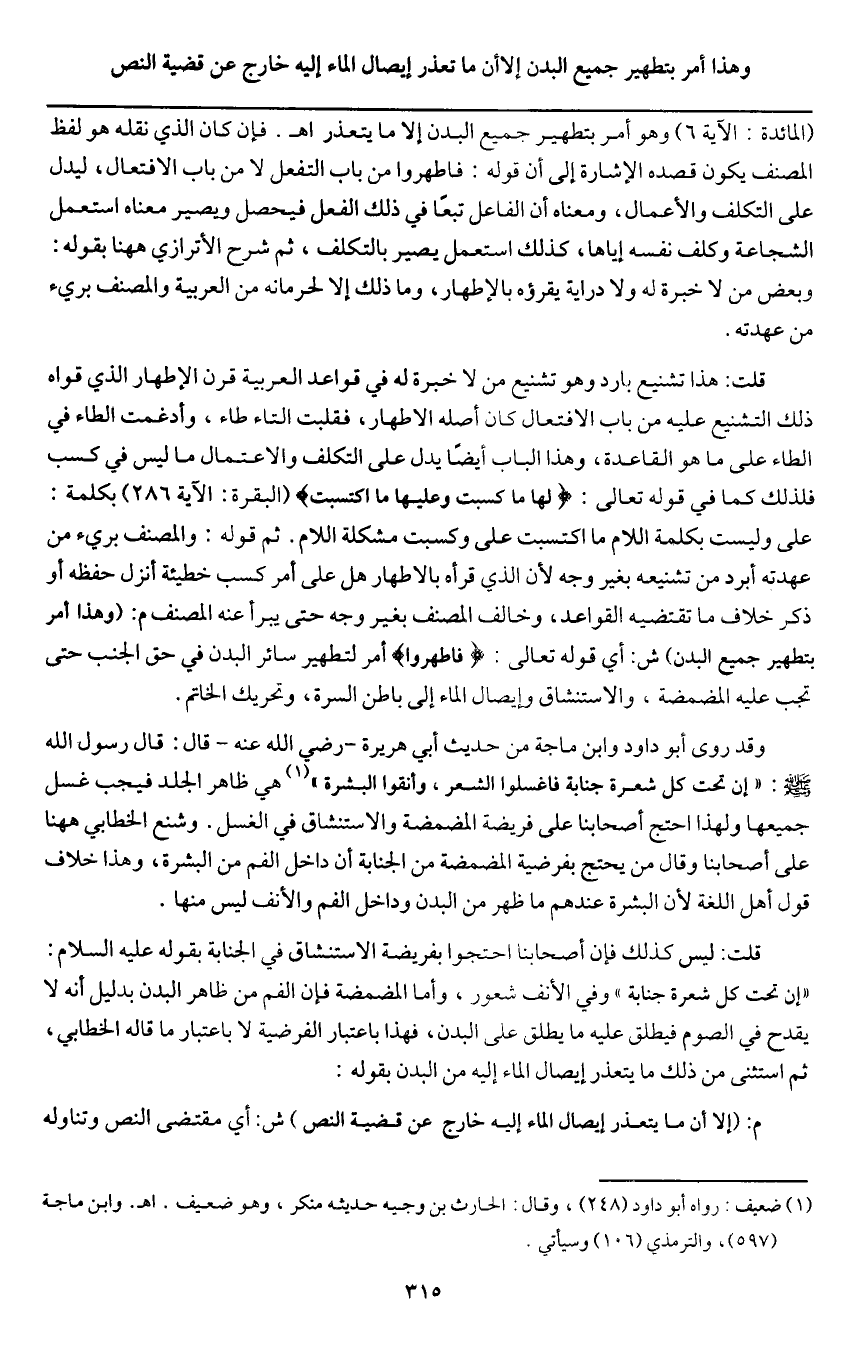 م: (إلا أن ما يتعذر إيصال الماء إليه خارج عن قضية النص) ش: أي مقتضى النص وتناوله