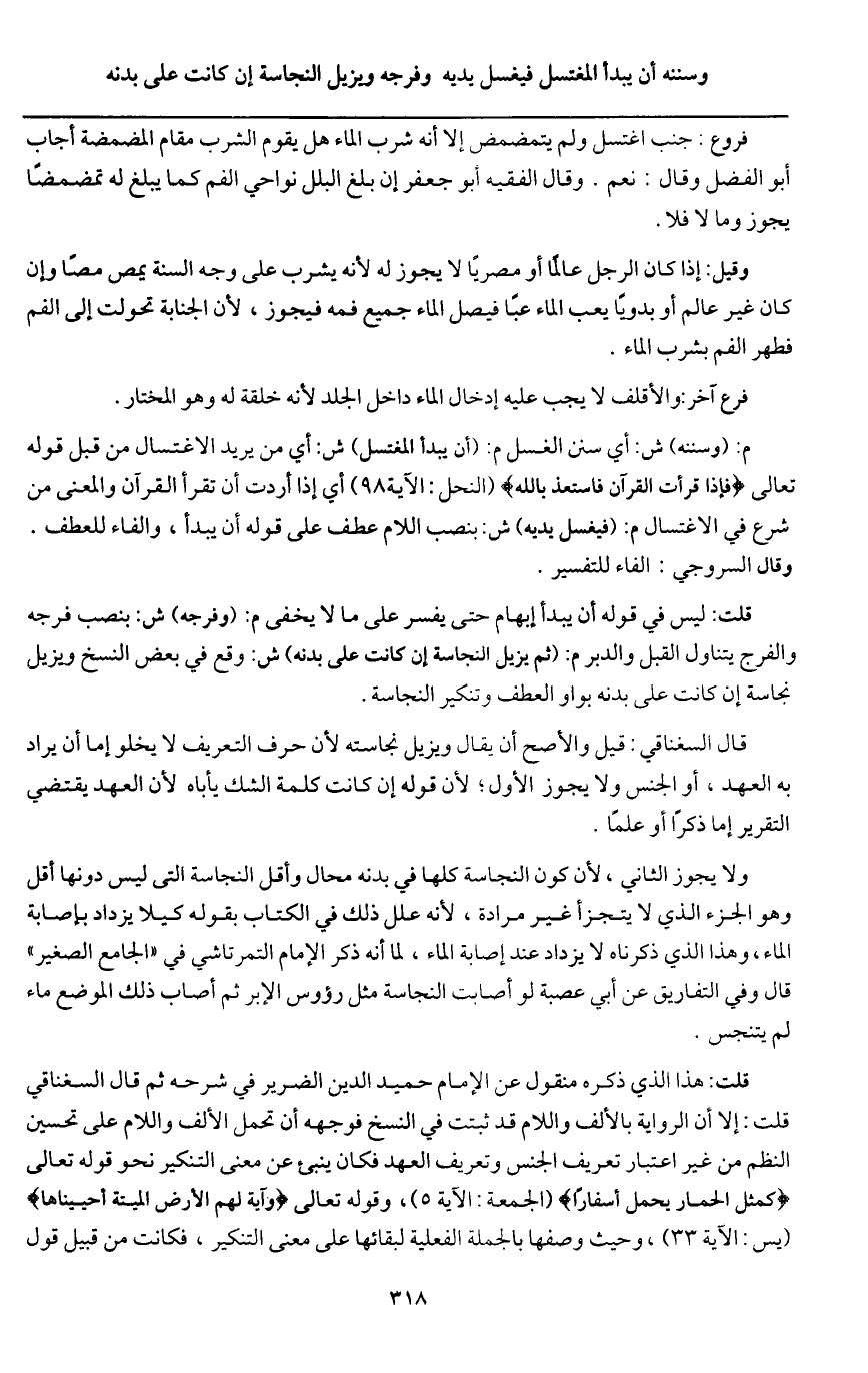 قلت: هذا الذي ذكره منقول عن الإمام حميد الدين الضرير في شرحه ثم قال السغناقي قلت: إلا أن الرواية بالألف واللام قد ثبتت في النسخ فوجهه أن تحمل الألف واللام على تحسين النظم من غير اعتبار تعريف الجنس وتعريف العهد فكان ينبئ عن معنى التنكير نحو قَوْله تَعَالَى {كَمَثَلِ الْحِمَارِ يَحْمِلُ أَسْفَارًا} [الجمعة: 5] (الجمعة: الآية 5) ، وقَوْله تَعَالَى {وَآيَةٌ لَهُمُ الْأَرْضُ الْمَيْتَةُ أَحْيَيْنَاهَا} [يس: 33] (يس: الآية 33) ، وحيث وصفها بالجملة الفعلية لبقائها على معنى التنكير، فكانت من قبيل قول