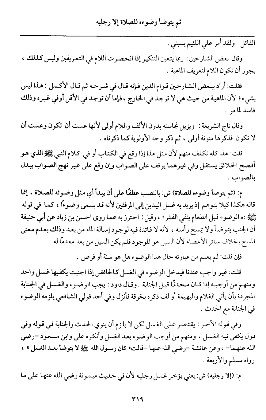 وفي قوله الآخر: يقتصر على الغسل لكن لا يلزم أن ينوي الحدث والجنابة في قوله وفي قول يكفي نية الغسل، ومنهم من أوجب الوضوء بعد الغسل وأنكره علي وابن مسعود - رَضِيَ اللَّهُ عَنْهُمَا -، وعن عائشة - رَضِيَ اللَّهُ عَنْهَا - قالت: «كان رسول الله - صَلَّى اللَّهُ عَلَيْهِ وَسَلَّمَ - لا يتوضأ بعد الغسل» ، رواه مسلم والأربعة.