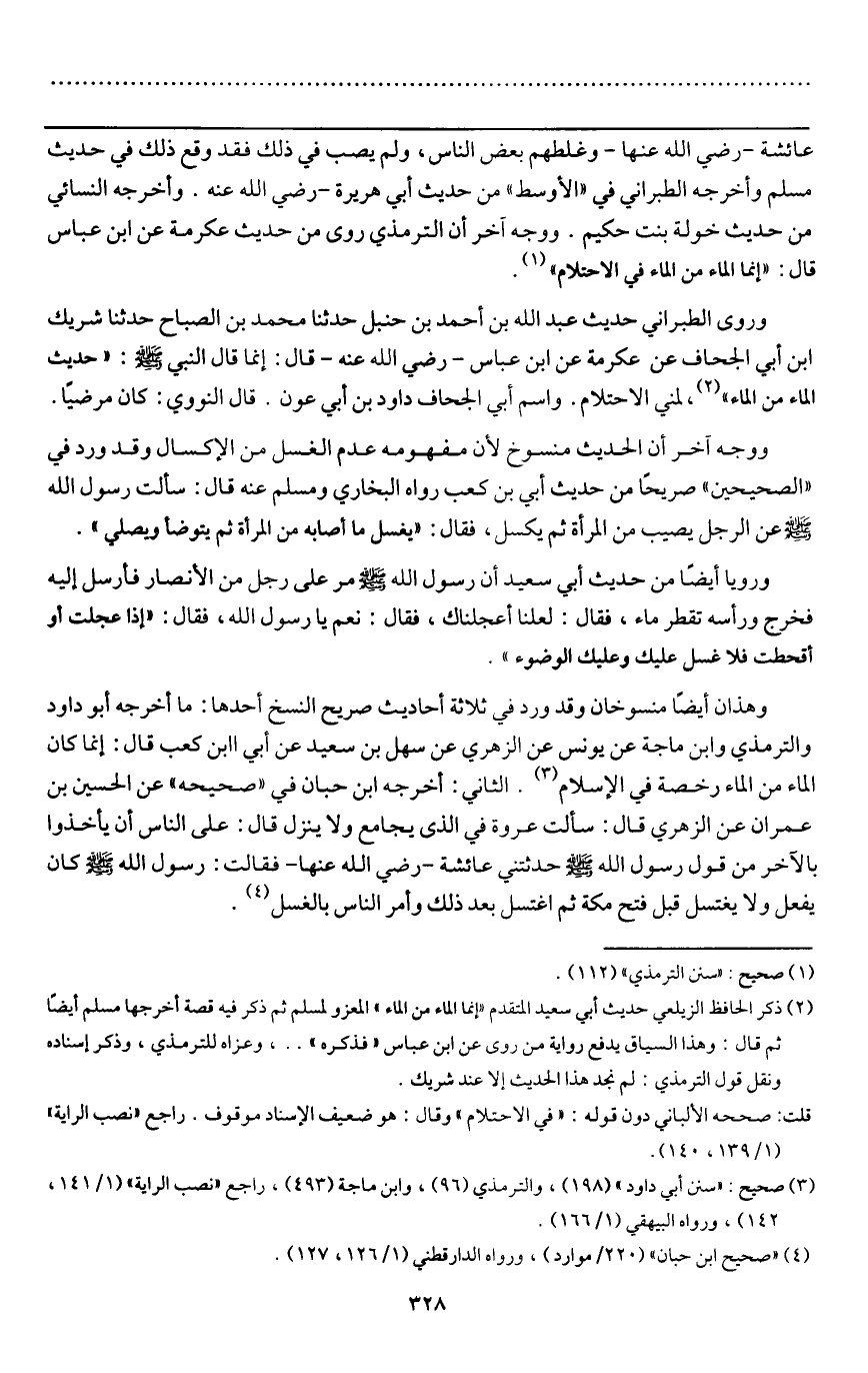 وروى الطبراني حديث عبد الله بن أحمد بن حنبل حدثنا محمد بن الصباح حدثنا شريك بن أبي الجحاف عن عكرمة عن ابن عباس - رَضِيَ اللَّهُ عَنْهُ - قال: إنما قال النبي - صَلَّى اللَّهُ عَلَيْهِ وَسَلَّمَ -: " حديث «الماء من الماء» ، لمني الاحتلام. واسم أبي الجحاف داود بن أبي عون. قال النووي: كان مرضيا.