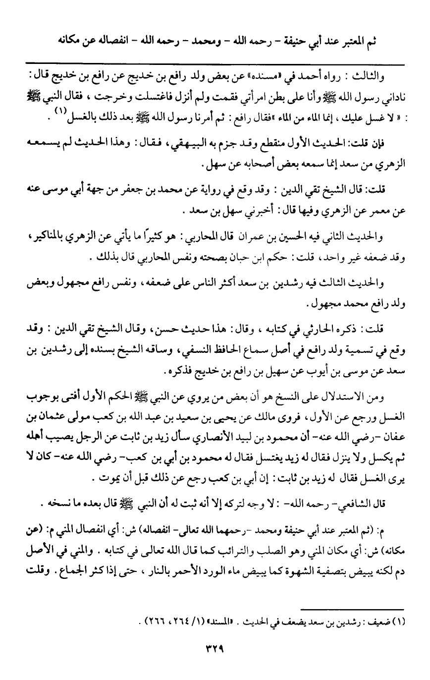 ـــــــــــــــــــــــــــــQوالثالث: رواه أحمد في "مسنده " عن بعض ولد رافع بن خديج عن «رافع بن خديج قال ناداني رسول الله - صَلَّى اللَّهُ عَلَيْهِ وَسَلَّمَ - وأنا على بطن امرأتي فقمت ولم أنزل فاغتسلت وخرجت فقال النبي - صَلَّى اللَّهُ عَلَيْهِ وَسَلَّمَ - لا غسل عليك إنما الماء من الماء» فقال رافع: ثم أمرنا رسول الله - صَلَّى اللَّهُ عَلَيْهِ وَسَلَّمَ - بعد ذلك بالغسل.