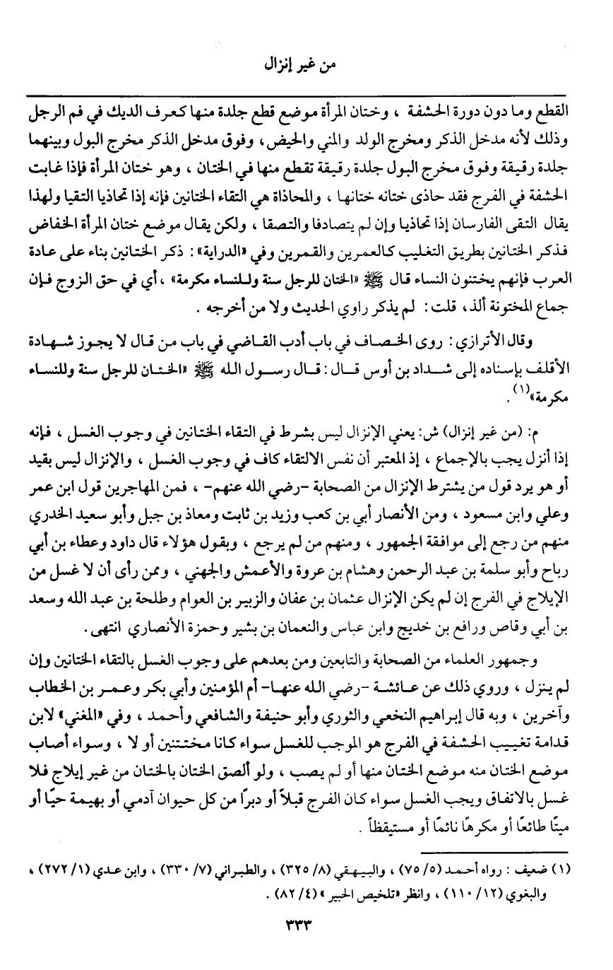 وجمهور العلماء من الصحابة والتابعين ومن بعدهم على وجوب الغسل بالتقاء الختانين وإن لم ينزل، وروي ذلك عن عائشة - رَضِيَ اللَّهُ عَنْهَا - أم المؤمنين وأبي بكر وعمر بن الخطاب وآخرين، وبه قال إبراهيم النخعي والثوري وأبو حنيفة والشافعي وأحمد، وفي " المغني " لابن قدامة تغييب الحشفة في الفرج هو الموجب للغسل سواء كانا مختتنين أو لا، وسواء أصاب موضع الختان منه موضع الختان منها أو لم يصب، ولو ألصق الختان بالختان من غير إيلاج فلا غسل بالاتفاق ويجب الغسل سواء كان الفرج قبلا أو دبرا من كل حيوان آدمي أو بهيمة حيا أو ميتا طائعا أو مكرها نائما أو مستيقظا.