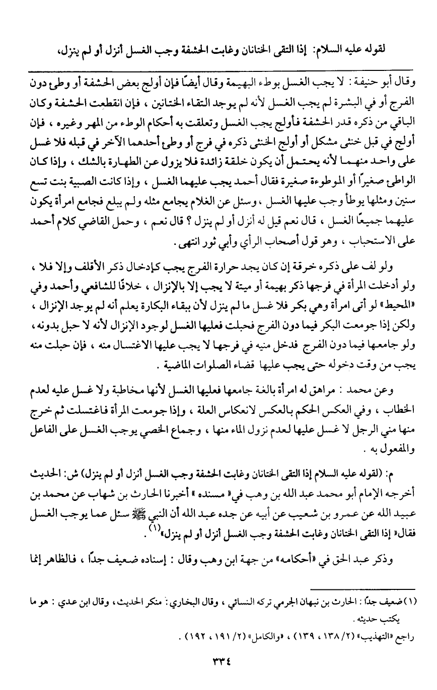م: (لقوله - عَلَيْهِ السَّلَامُ - «إذا التقى الختانان وغابت الحشفة وجب الغسل أنزل أو لم ينزل» ش: الحديث أخرجه الإمام أبو محمد عبد الله بن وهب في "مسنده " أخبرنا الحارث بن شهاب عن محمد بن عبيد الله عن عمرو بن شعيب عن أبيه عن جده عبد الله أن النبي - صَلَّى اللَّهُ عَلَيْهِ وَسَلَّمَ - «سئل عما يوجب الغسل فقال "إذا التقى الختانان وغابت الحشفة وجب الغسل أنزل أو لم ينزل» .