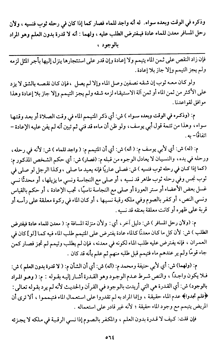 م: (ولهما) ش: أي لأبي حنيفة ومحمد م: (أنه) ش: أن الشأن م: (لا قدرة بدون العلم) ش: فلا يكون واجداً، والنص شرط عدم الوجود وهو القدرة أشار إليه بقوله: م: (وهو المراد بالوجود) ش: أي القدرة هي التي أريدت بالوجود في القرآن والحديث؛ لأنه لم يرد بقوله تعالى: {فَلَمْ تَجِدُوا} [المائدة: 6] عدم الماء حقيقة، وإنما المراد به لم تقدروا على استعمال الماء فتيمموا، إلا ترى أن المريض يتيمم مع وجود الماء حقيقة؛ لأنه غير قادر على استعماله.