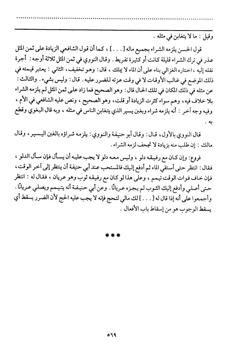 قول الحسن يلزمه الشراء بجميع ماله [ ... ] ، كما أن قول الشافعي الزيادة على ثمن المثل عذر في ترك الشراء قليلة كانت أو كثيرة تفريط. وقال النووي في ثمن المثل ثلاثة أوجه: أجرة نقله إليه، اختاره الغزالي بناء على أن الماء لا يملك، قال: وهو تخفيف، والثاني: يعتبر قيمته في ذلك الموضع في غالب الأوقات، لا في وقت عزته للضرر عليه. قال: وليس بشيء. والثالث: عن مثله في ذلك المكان في تلك الحال، قال: وهو الصحيح، فما زاد على ثمن المثل لم يلزمه الشراء بلا خلاف فيه، وهم سواء كثرت الزيادة أو قلت، وهو الصحيح، ونص عليه الشافعي في الأم، وفيه وجه آخر: أنه يلزمه شراء وبغبن يسير الذي يتغابن الناس في مثله، وبه قال البغوي وقطع به.