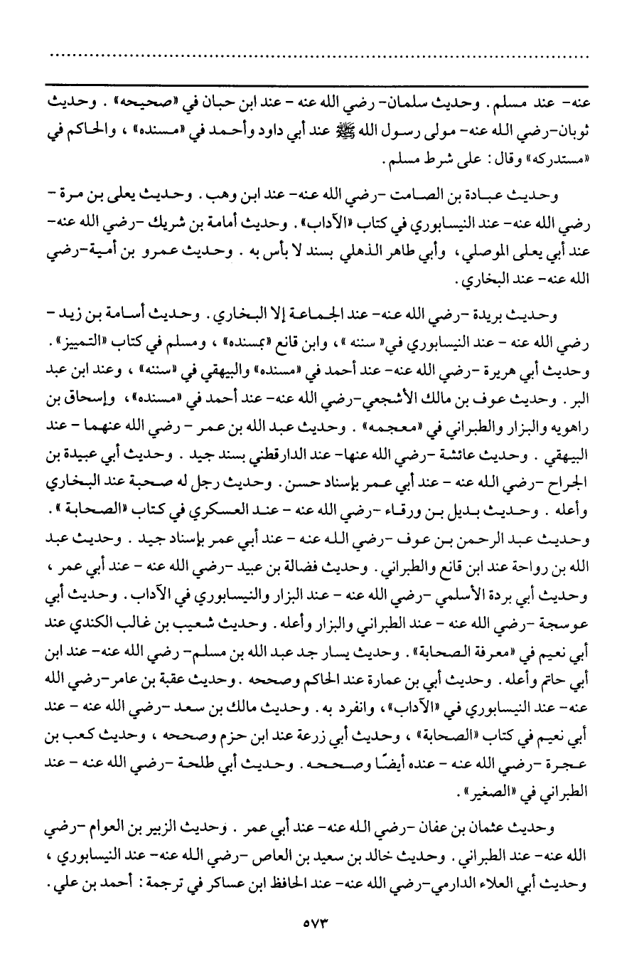 وحديث بريدة - رَضِيَ اللَّهُ عَنْهُ - عند الجماعة إلا البخاري. وحديث أسامة بن زيد - رَضِيَ اللَّهُ عَنْهُ - عند النيسابوري في " سننه "، وابن قانع " بمسنده "، ومسلم في كتاب " التمييز ". وحديث أبي هريرة - رَضِيَ اللَّهُ عَنْهُ - عند أحمد في " مسنده " والبيهقي في " سننه "، وعند ابن عبد البر. وحديث عوف بن مالك الأشجعي - رَضِيَ اللَّهُ عَنْهُ - عند أحمد في " مسنده "، وإسحاق بن راهويه والبزار والطبراني في " معجمه ". وحديث عبد الله بن عمر - رَضِيَ اللَّهُ عَنْهُمَا - عند البيهقي. وحديث عائشة - رَضِيَ اللَّهُ عَنْهَا - عند الدارقطني بسند جيد. وحديث أبي عبيدة بن الجراح - رَضِيَ اللَّهُ عَنْهُ - عند أبي عمر بإسناد حسن. وحديث رجل له صحبة عند البخاري وأعله. وحديث بديل بن ورقاء - رَضِيَ اللَّهُ عَنْهُ - عند العسكري في كتاب " الصحابة ". وحديث عبد الرحمن بن عوف - رَضِيَ اللَّهُ عَنْهُ - عند أبي عمر بإسناد جيد. وحديث عبد الله بن رواحة عند ابن قانع والطبراني. وحديث فضالة بن عبيد - رَضِيَ اللَّهُ عَنْهُ - عند أبي عمر، وحديث أبي بردة الأسلمي - رَضِيَ اللَّهُ عَنْهُ - عند البزار والنيسابوري في الآداب. وحديث أبي عوسجة - رَضِيَ اللَّهُ عَنْهُ - عند الطبراني والبزار وأعله. وحديث شعيب بن غالب الكندي عند أبي نعيم في " معرفة الصحابة ". وحديث يسار جد عبد الله بن مسلم - رَضِيَ اللَّهُ عَنْهُ - عند ابن أبي حاتم وأعله. وحديث أبي بن عمارة عند الحاكم وصححه. وحديث عقبة بن عامر - رَضِيَ اللَّهُ عَنْهُ - عند النيسابوري في "الآداب"، وانفرد به. وحديث مالك بن سعد - رَضِيَ اللَّهُ عَنْهُ - عند أبي نعيم في كتاب " الصحابة "، وحديث أبي زرعة عند ابن حزم وصححه، وحديث كعب بن عجرة - رَضِيَ اللَّهُ عَنْهُ - عنده أيضاً وصححه. وحديث أبي طلحة - رَضِيَ اللَّهُ عَنْهُ - عند الطبراني في " الصغير ".