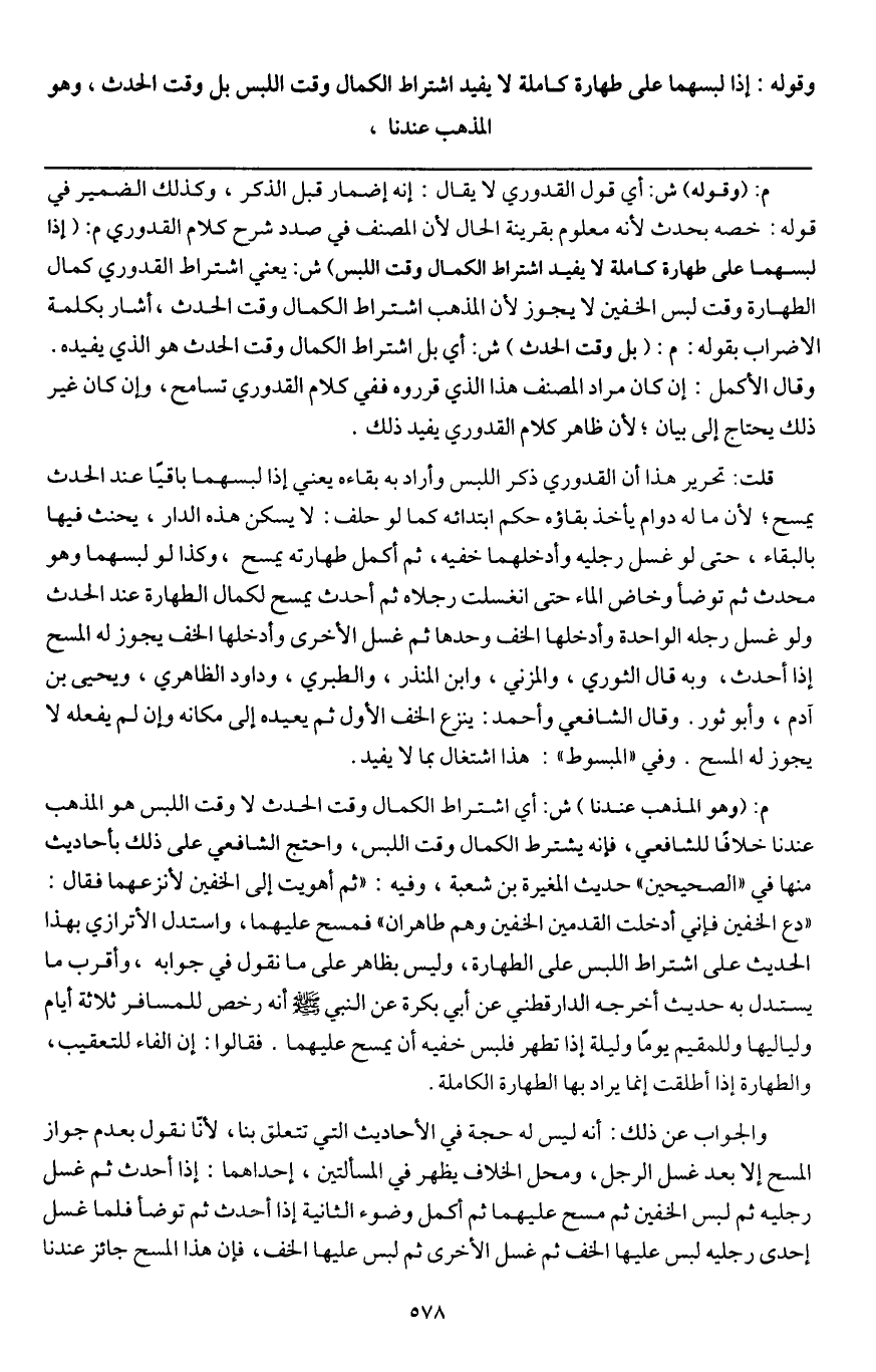 ـــــــــــــــــــــــــــــQم: (وقوله) شك أي قول القدوري لا يقال: إنه إضمار قبل الذكر، وكذلك الضمير في قوله: خصه بحدث؛ لأنه معلوم بقرينة الحال؛ لأن المصنف في صدد شرح كلام القدوري م: (إذا لبسهما على طهارة كاملة لا يفيد اشتراط الكمال وقت اللبس) ش: يعني اشتراط القدوري كمال الطهارة وقت لبس الخفين لا يجوز؛ لأن المذهب اشتراط الكمال وقت الحدث، أشار بكلمة الإضراب بقوله: م: (بل وقت الحدث) ش: أي بل اشتراط الكمال وقت الحدث هو الذي يفيده. وقال الأكمل: إن كان مراد المصنف هذا الذي قرروه ففي كلام القدوري تسامح، وإن كان غير ذلك يحتاج إلى بيان؛ لأن ظاهر كلام القدوري يفيد ذلك.
