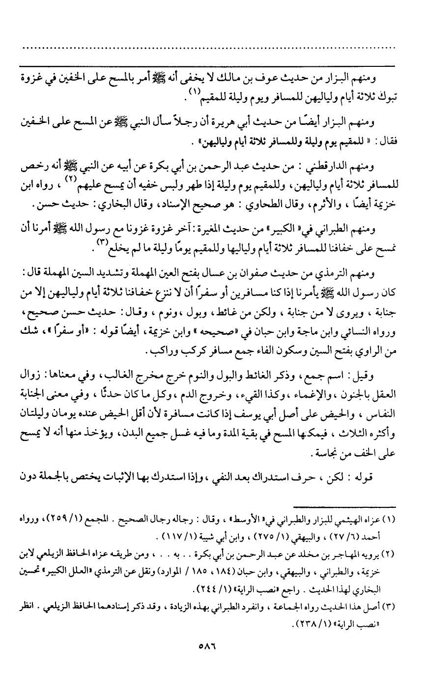 ـــــــــــــــــــــــــــــQومنهم البزار من حديث عوف بن مالك لا يخفى «أنه - صَلَّى اللَّهُ عَلَيْهِ وَسَلَّمَ - أمر بالمسح على الخفين في غزوة تبوك ثلاثة أيام ولياليهن للمسافر، ويوم وليلة للمقيم» .