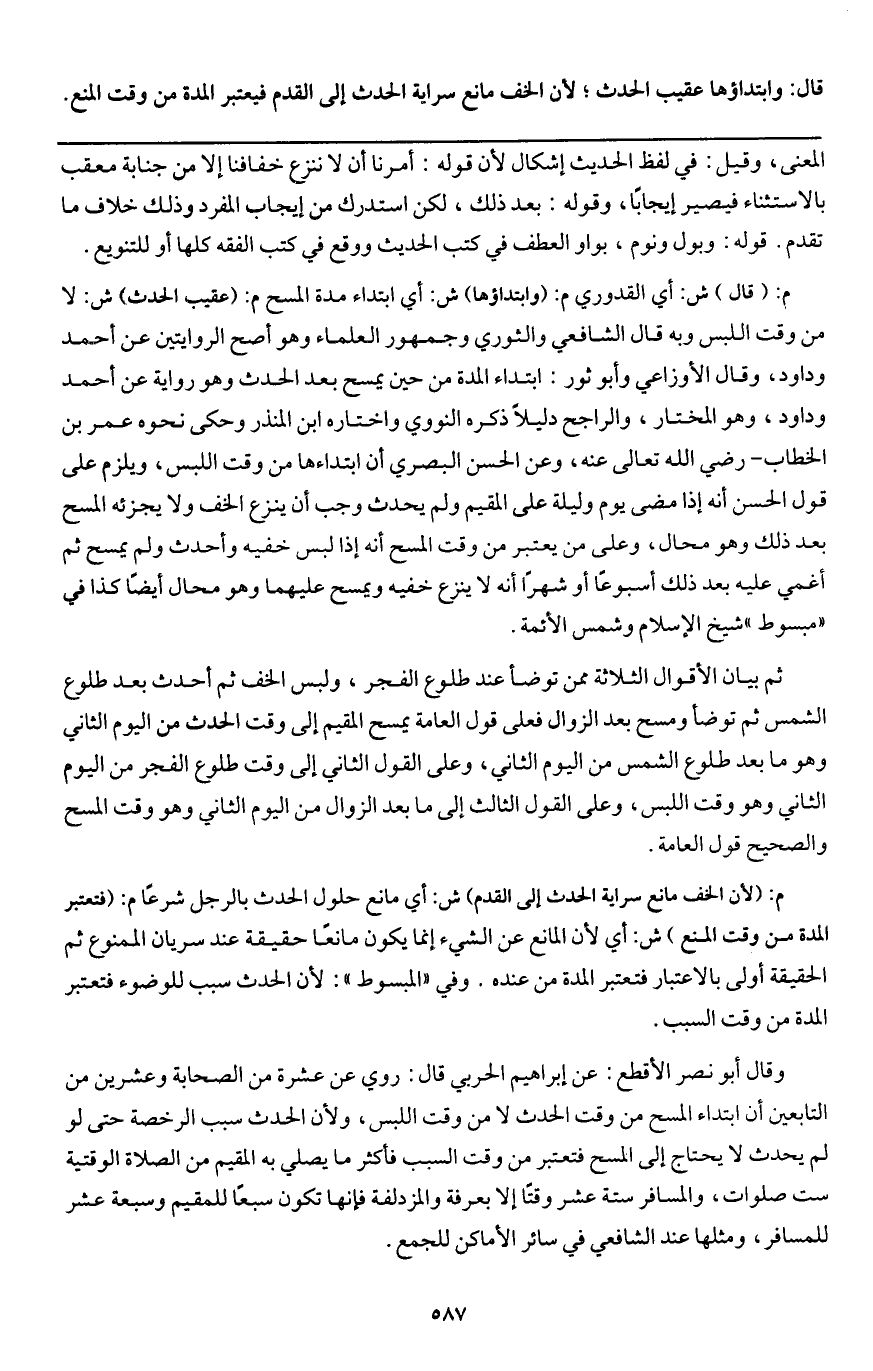 م: (قال) ش: أي القدوري م: (وابتداؤها) ش: أي ابتداء مدة المسح م: (عقيب الحدث) ش: لا من وقت اللبس، وبه قال الشافعي والثوري وجمهور العلماء، وهو أصح الروايتين عن أحمد وداود، وقال الأوزاعي وأبو ثور: ابتداء المدة من حين يمسح بعد الحدث وهو رواية عن أحمد وداود، وهو المختار، والراجح دليلاً ذكره النووي واختاره ابن المنذر وحكى نحوه عمر بن الخطاب - رَضِيَ اللَّهُ تَعَالَى عَنْهُ -، وعن الحسن البصري أن ابتداءها من وقت اللبس، ويلزم على قول الحسن أنه إذا مضى يوم وليلة على المقيم ولم يحدث وجب أن ينزع الخف ولا يجزئه المسح بعد ذلك وهو محال، وعلى من يعتبر من وقت المسح أنه إذا لبس خفيه وأحدث ولم يمسح ثم أغمي عليه بعد ذلك أسبوعاً أو شهراً أنه لا ينزع خفيه ويمسح عليهما وهو محال أيضاً، كذا في " مبسوط " شيخ الإسلام وشمس الأئمة.