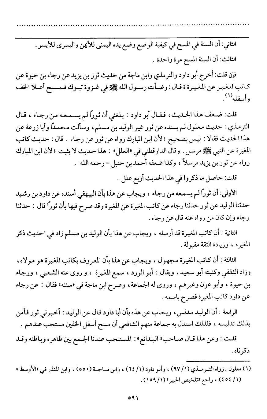 الرابعة: أن الوليد مدلس، ويجاب عن هذه بأن أبا داود قال عن الوليد: أخبرني ثور، فأمن بذلك تدليسه، فلذلك استدل به جماعة منهم الشافعي أن مسح أسفل الخفين مستحب عندهم.