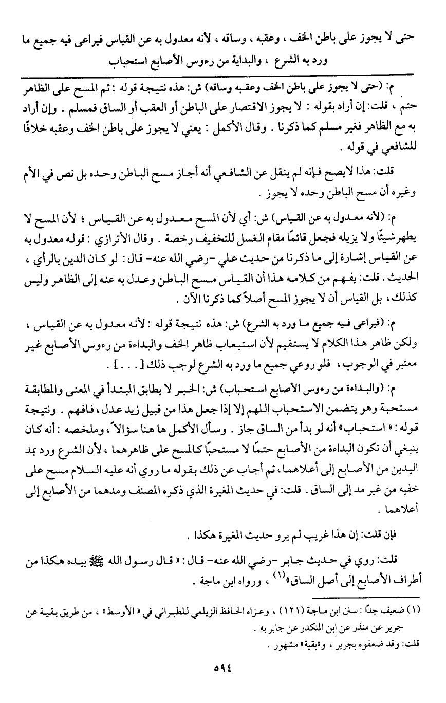 ـــــــــــــــــــــــــــــQم: (حتى لا يجوز على باطن الخف وعقبه وساقه) ش: هذه نتيجة قوله: ثم المسح على الظاهر حتم، قلت: إن أراد بقوله: لا يجوز الاقتصار على الباطن أو العقب أو الساق فمسلم. وإن أراد به مع الظاهر فغير مسلم كما ذكرنا. وقال الأكمل: يعني لا يجوز على باطن الخف وعقبه خلافاً للشافعي في قوله.