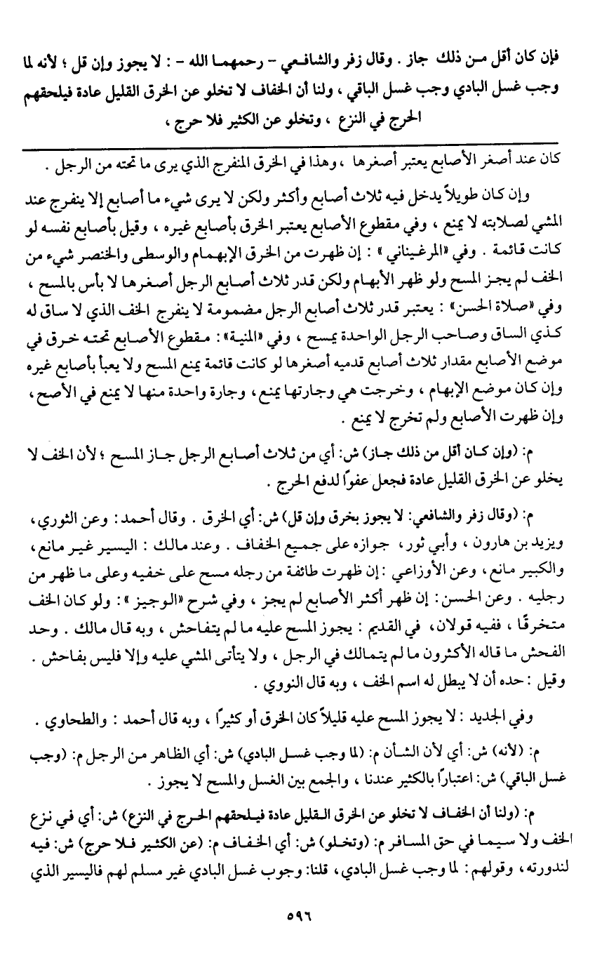 م: (وقال زفر والشافعي: لا يجوز بخرق وإن قل) ش: أي الخرق. وقال أحمد: وعن الثوري، ويزيد بن هارون، وأبي ثور، جوازه على جميع الخفاف. وعند مالك: اليسير غير مانع، والكبير مانع، وعن الأوزاعي: إن ظهرت طائفة من رجله مسح على خفيه وعلى ما ظهر من رجليه. وعن الحسن: إن ظهر أكثر الأصابع لم يجز، وفي شرح " الوجيز ": ولو كان الخف متخرقاً ففيه قولان، في القديم: يجوز المسح عليه ما لم يتفاحش، وبه قال مالك. وحد الفحش ما قاله الأكثرون ما لم يتمالك في الرجل، ولا يتأتى المشي عليه، وإلا فليس بفاحش. وقيل: حده أن لا يبطل له اسم الخف، وبه قال النووي.