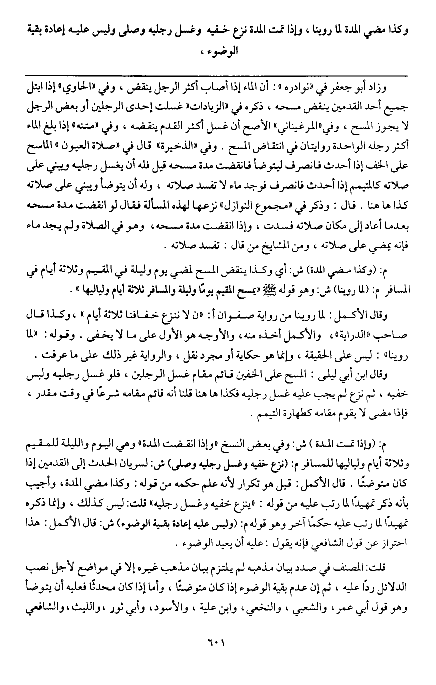 ـــــــــــــــــــــــــــــQوزاد أبو جعفر في " نوادره ": أن الماء إذا أصاب أكثر الرجل ينقض، وفي " الحاوي " إذا ابتل جميع أحد القدمين ينق مسحه، ذكره في " الزيادات " غسلت إحدى الرجلين أو بعض الرجل لا يجوز المسح، وفي " المرغيناني " الأصح أن غسل أكثر القدم ينقضه، وفي " متنه " إذا بلغ الماء أكثر رجله الواحدة روايتان في انتقاض المسح. وفي " الذخيرة " قال في " صلاة العيون " الماسح على الخف إذا أحدث فانصرف ليتوضأ فانقضت مدة مسحه قيل فله أن يغسل رجليه ويبني على صلاته كالمتيمم إذا أحدث فانصرف فوجد ماء لا تفسد صلاته، وله أن يتوضأ ويبني على صلاته كذا ها هنا. قال: وذكر في " مجموع النوازل " نزعها لهذه المسألة فقال: لو انقضت مدة مسحه بعدما أعاد إلى مكان صلاته فسدت، وإذا انقضت مدة مسحه، وهو في الصلاة ولم بجد ماء فإنه يمضي على صلاته، ومن المشايخ من قال: تفسد صلاته.
