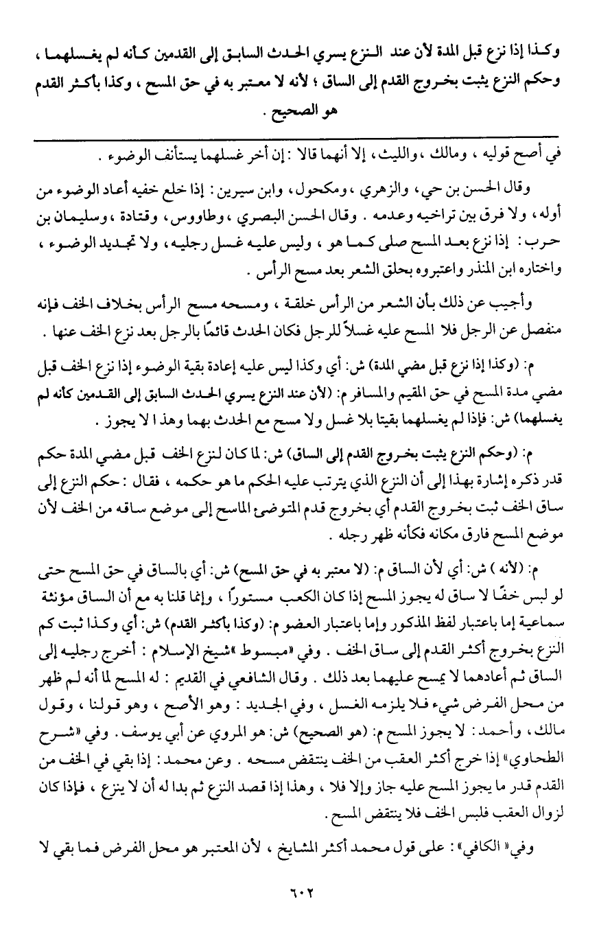 وحكم النزع يثبت بخروج القدم إلى الساق؛ لأنه لا معتبر به في حق المسح، وكذا بأكثر القدم هو الصحيح.