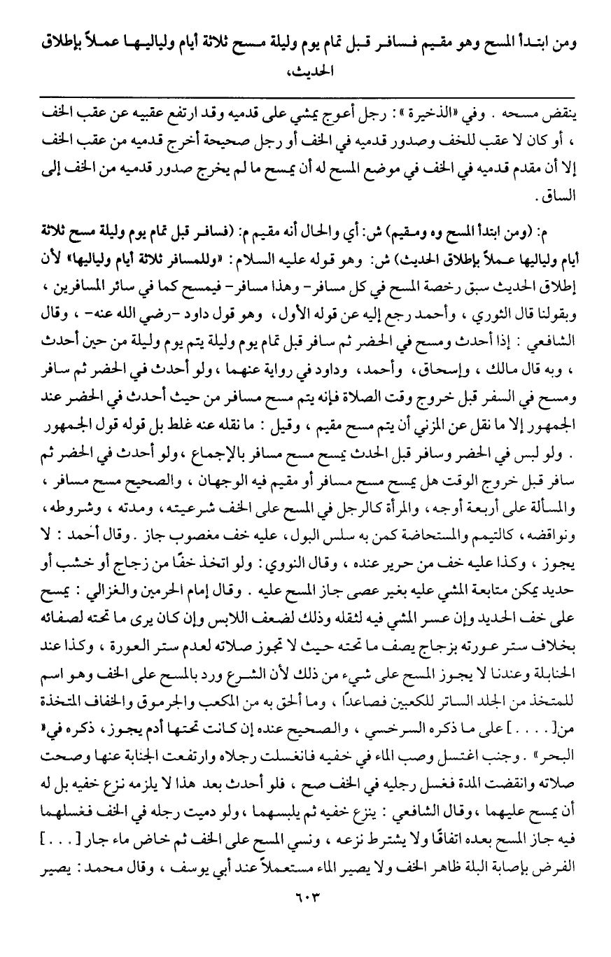 ـــــــــــــــــــــــــــــQينقض مسحه. وفي " الذخيرة ": رجل أعوج يمشي على قدميه وقد ارتفع عقباه عن عقب الخف، أو كان لا عقب للخف وصدور قدميه في الخف، أو رجل صحيحة أخرج قدميه من عقب الخف إلا أن مقدم قدميه في الخف في موضع المسح له أن يمسح ما لم يخرج صدور قدميه من الخف إلى الساق.