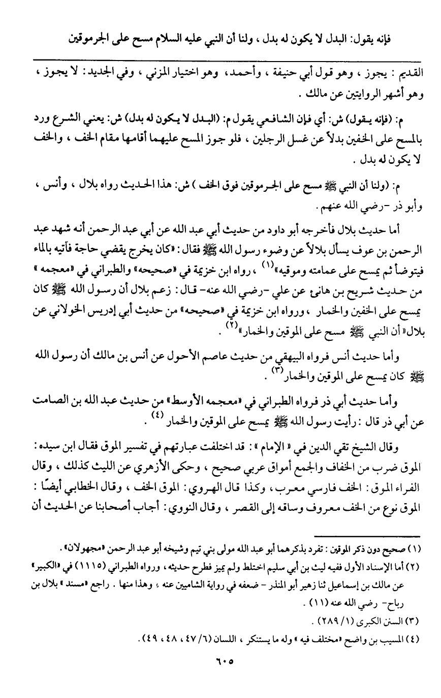 م: (ولنا «أن النبي - صَلَّى اللَّهُ عَلَيْهِ وَسَلَّمَ - مسح على الجرموقين فوق الخف» ش: هذا الحديث رواه بلال، وأنس، وأبو ذر - رَضِيَ اللَّهُ عَنْهُمْ -.