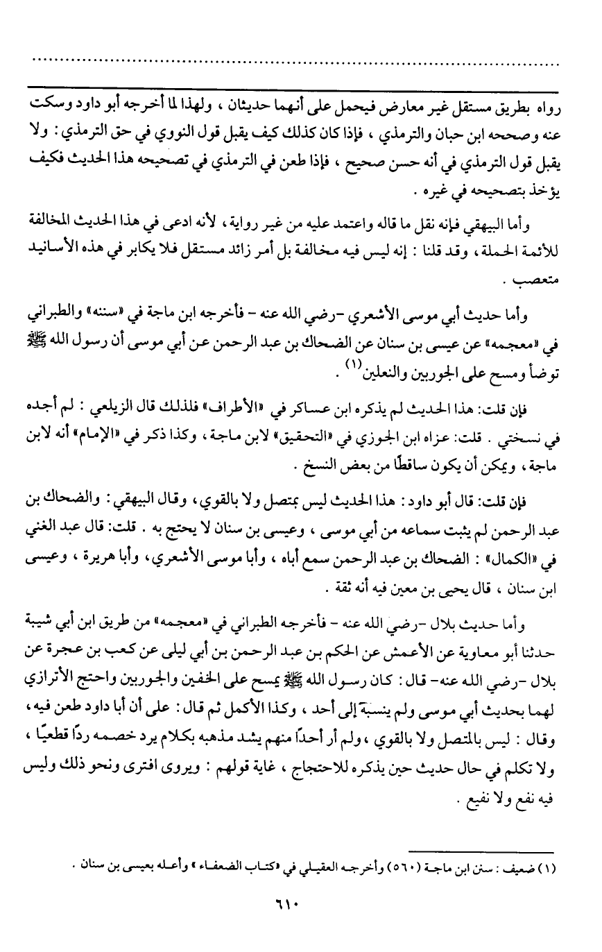 وأما حديث أبي موسى الأشعري - رَضِيَ اللَّهُ عَنْهُ - فأخرجه ابن ماجه في " سننه " والطبراني في " معجمه " عن عيسى ابن سنان، عن الضحاك بن عبد الرحمن، عن أبي موسى «أن رسول الله - صَلَّى اللَّهُ عَلَيْهِ وَسَلَّمَ - توضأ ومسح على الجوربين والنعلين» .