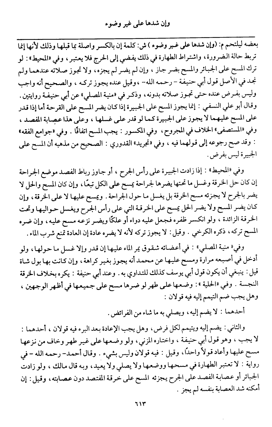 وفي " المحيط ": إذا زادت الجبيرة على رأس الجرح، أو جاوز رباط الفصد موضع الجراحة إن كان حل الخرقة وغسل ما تحتها يضرها لجراحة يمسح على الكل تبعاً، وإن كان المسح والحل لا يضر بالجرح لا يجزئه مسح الخرقة، بل يغسل ما حول الجراحة. ويمسح عليها لا على الخرقة، وإن كان يضر المسح ولا يضر الحل يمسح على الخرقة التي على رأس الجرح ويغسل حواليها وتحت الخرقة الزائدة، ولو انكسر ظفره فجعل عليه دواء أو علكاً ويضر نزعه مسح عليه، وإن ضره المسح تركه، ذكره الكرخي. وقيل: لا يجوز تركه؛ لأنه لا يضره عادة، إن العادة تمنع شرب الماء.