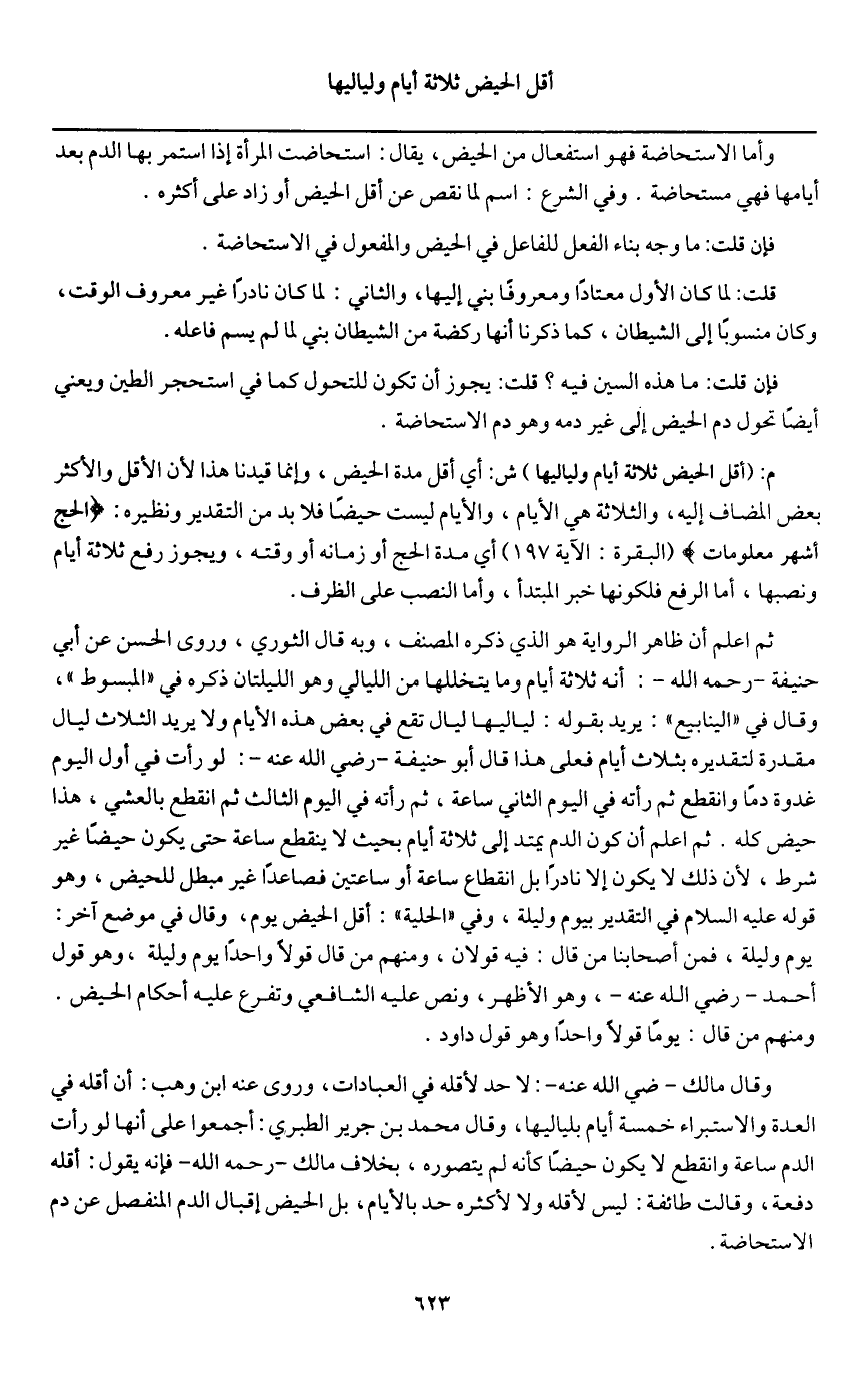 وقال مالك - رَضِيَ اللَّهُ عَنْهُ -: لا حد لأقله في العبادات، وروى عنه ابن وهب: أن أقله في العدة والاستبراء خمسة أيام بلياليها، وقال محمد بن جرير الطبري: أجمعوا على أنها لو رأت الدم ساعة وانقطع لا يكون حيضاً كأنه لم يتصوره، بخلاف مالك - رَحِمَهُ اللَّهُ - فإنه يقول: أقله دفعة، وقالت: طائفة: ليس لأقله ولا لأكثره حد بالأيام، بل الحيض إقبال الدم المنفصل عن دم الاستحاضة.