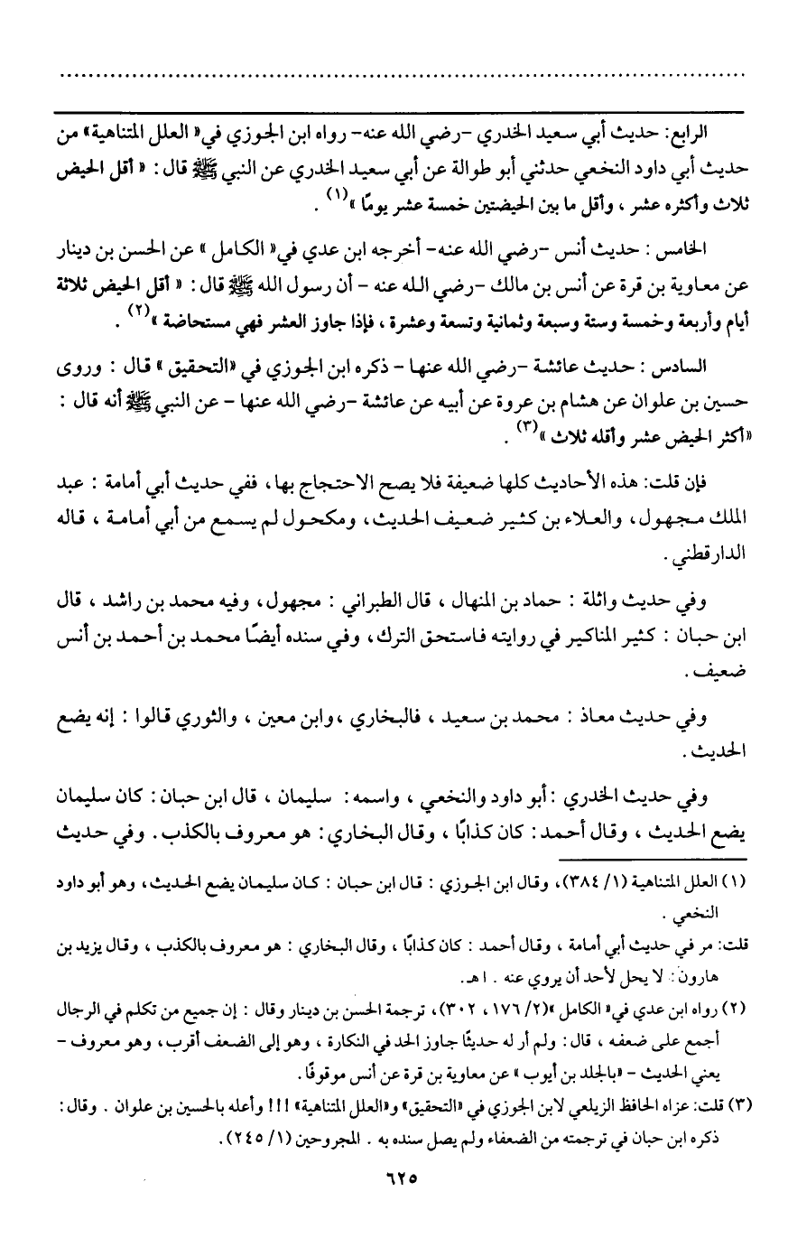ـــــــــــــــــــــــــــــQالرابع: حديث أبي سعيد الخدري - رَضِيَ اللَّهُ عَنْهُ - رواه ابن الجوزي في " العلل المتناهية " من حديث أبي داود النخعي، حدثني أبو طوالة، عن أبي سعيد الخدري، عن النبي - صَلَّى اللَّهُ عَلَيْهِ وَسَلَّمَ - قال: «أقل الحيض ثلاث وأكثره عشر، وأقل ما بين الحيضتين خمسة عشر يوماً» .