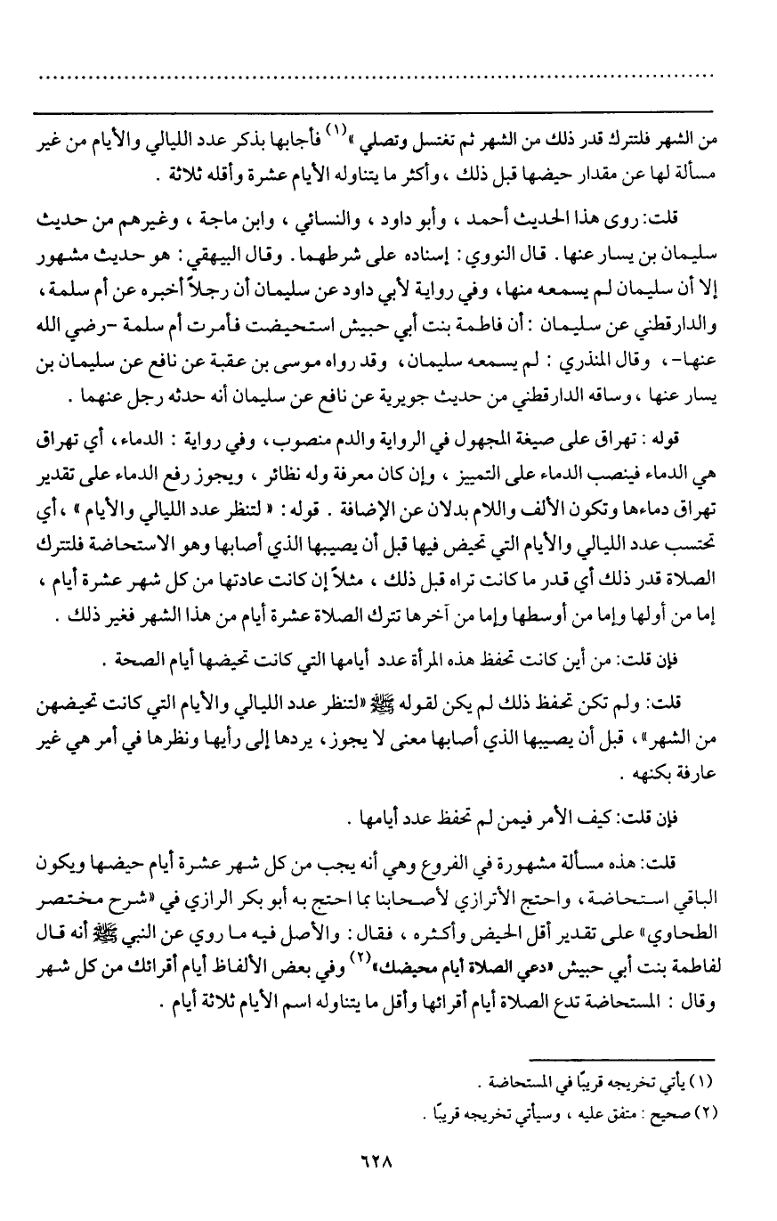 قلت: روى هذا الحديث أحمد، وأبو داود، والنسائي، وابن ماجه، وغيرهم من حديث سليمان بن يسار عنها. قال النووي: إسناده على شرطهما. وقال البيهقي: هو حديث مشهور، إلا أن سليمان لم يسمعه منها، وفي رواية لأبي داود عن سليمان أن رجلاً أخبره عن أم سلمة، والدارقطني عن سليمان: أن فاطمة بنت أبي حبيش استحيضت فأمرت أم سلمة - رَضِيَ اللَّهُ عَنْهَا -، وقال المنذري: لم يسمعه سليمان، وقد رواه موسى بن عقبة عن نافع، عن سليمان بن يسار عنها، وساقه الدارقطني من حديث جويرية عن نافع عن سليمان، أنه حدثه رجل عنهما.