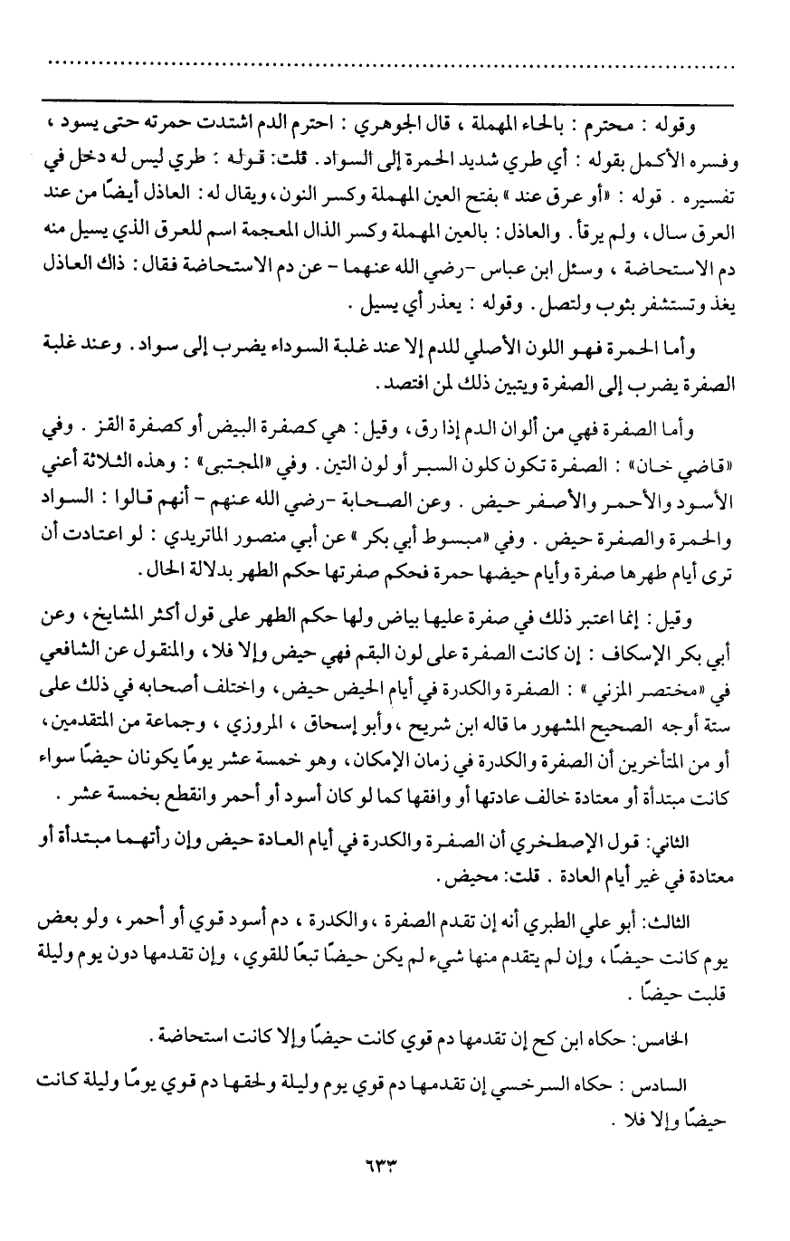 وأما الصفرة فهي من ألوان الدم إذا رق، وقيل: هي كصفرة البيض أو كصفرة القز. وفي " قاضي خان ": الصفرة تكون كلون السبر أو لون التين. وفي " المجتبى ": وهذه الثلاثة أعني الأسود والأحمر والأصفر حيض. وعن الصحابة - رَضِيَ اللَّهُ عَنْهُمْ - أنهم قالوا: السواد والحمرة والصفرة حيض. وفي " مبسوط أبي بكر " عن أبي منصور الماتريدي: لو اعتادت أن ترى أيام طهرها صفرة وأيام حيضها حمرة فحكم صفرتها حكم الطهر بدلالة الحال.
