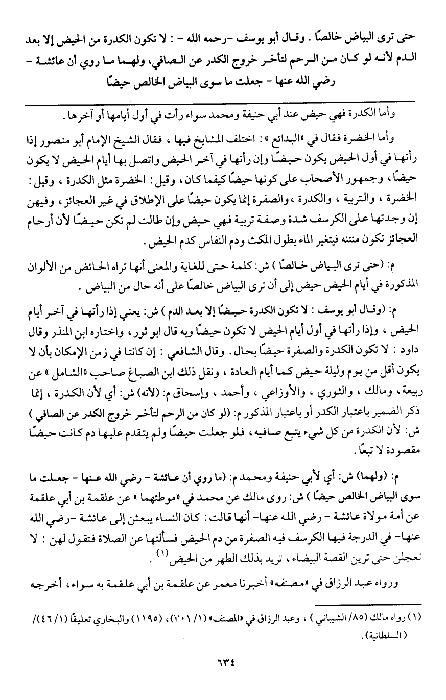حتى ترى البياض خالصا. وقال أبو يوسف - رَحِمَهُ اللَّهُ -: لا تكون الكدرة من الحيض إلا بعد الدم؛ لأنه لو كان من الرحم لتأخر خروج الكدر عن الصافي، ولهما ما روي أن عائشة - رَضِيَ اللَّهُ عَنْهَا - جعلت ما سوى البياض الخالص حيضا
