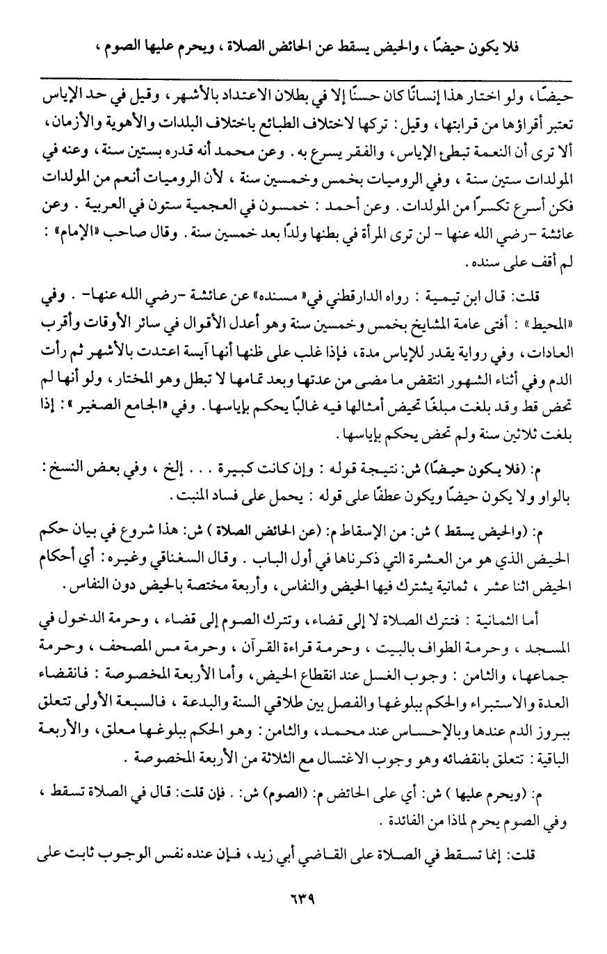 قلت: قال ابن تيمية: رواه الدارقطني في " مسنده " عن عائشة - رَضِيَ اللَّهُ عَنْهَا -. وفي " المحيط ": أفتى عامة المشايخ بخمس وخمسين سنة وهو أعدل الأقوال في سائر الأوقات وأقرب العادات، وفي رواية يقدر للإياس مدة، فإذا غلب على ظنها آيسة اعتدت بالأشهر ثم رأت الدم وفي أثناء الشهور انتقض ما مضى من عدتها وبعد تمامها لا تبطل وهو المختار، ولو أنا لم تحض قط وقد بلغت مبلغاً تحيض أمثالها فيه غالباً يحكم بإياسها. وفي " الجامع الصغير ": إذا بلغت ثلاثين سنة ولم تحض يحكم بإياسها.
