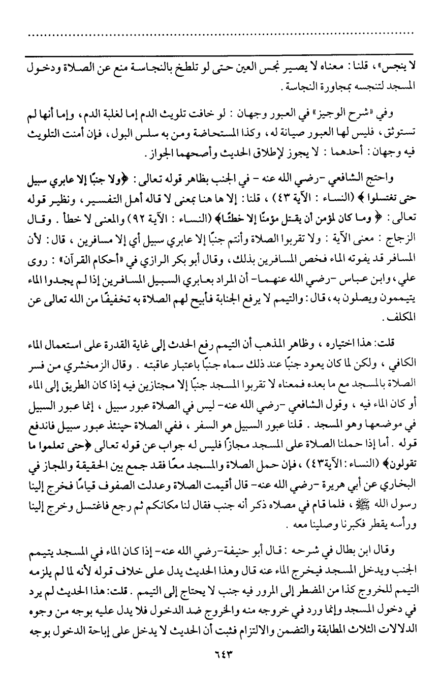 واحتج الشافعي - رَضِيَ اللَّهُ عَنْهُ - في الجنب بظاهر قَوْله تَعَالَى: {وَلَا جُنُبًا إِلَّا عَابِرِي سَبِيلٍ حَتَّى تَغْتَسِلُوا} [النساء: 43] (النساء: الآية 43) ، قلنا: إلا هاهنا بمعنى لا قاله أهل التفسير، ونظير قَوْله تَعَالَى {وَمَا كَانَ لِمُؤْمِنٍ أَنْ يَقْتُلَ مُؤْمِنًا إِلَّا خَطَأً} [النساء: 92] (النساء: الآية 92) والمعنى لا خطأ. وقال الزجاج: معنى الآية: ولا تقربوا الصلاة وأنتم جنبا إلا عابري سبيل أي إلا مسافرين، قال: لأن المسافر قد يفوته الماء فخص المسافرين بذلك، وقال أبو بكر الرازي في " أحكام القرآن ": روي علي، وابن عباس - رَضِيَ اللَّهُ عَنْهُمَا - أن المراد بعابري السبيل المسافرين إذا لم يجدوا الماء يتيممون ويصلون به، قال: والتيمم لا يرفع الجنابة فأبيح لهم الصلاة به تخفيفا من الله تعالى عن المكلف.