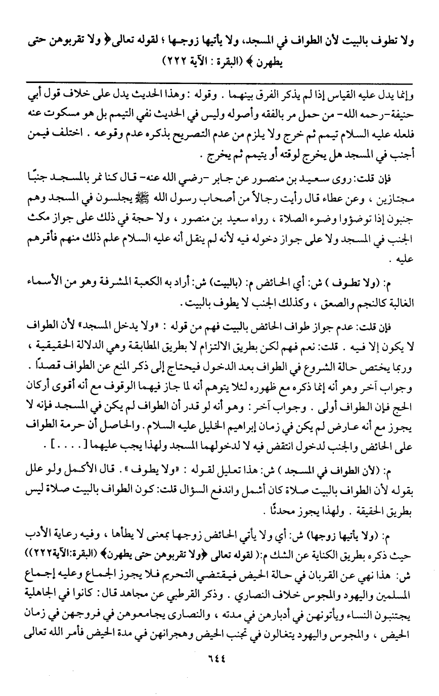 ولا تطوف بالبيت لأن الطواف في المسجد ولا يأتيها زوجها؛ لِقَوْلِهِ تَعَالَى {وَلَا تَقْرَبُوهُنَّ حَتَّى يَطْهُرْنَ} [البقرة: 222] (البقرة: الآية 222)