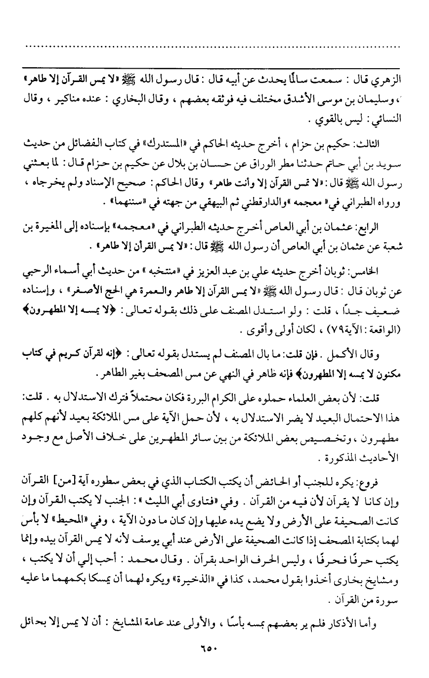 ـــــــــــــــــــــــــــــQالزهري قال: سمعت سالماً يحدث عن أبيه قال: قال رسول الله - صَلَّى اللَّهُ عَلَيْهِ وَسَلَّمَ - «لا يمس القرآن إلا طاهر» ، وسلمان بن موسى الأشدق مختلف فيه فوثقه بعضهم، وقال البخاري: عنده مناكير، وقال النسائي: ليس بالقوي.