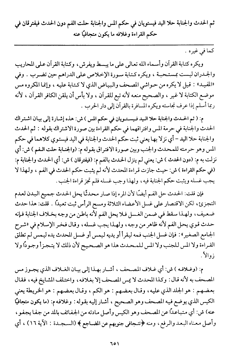 ثم الحدث والجنابة حلا اليد فيستويان في حكم المس والجنابة حلت الفم دون الحدث فيفترقان في حكم القراءة وغلافه ما يكون متجافيا عنه