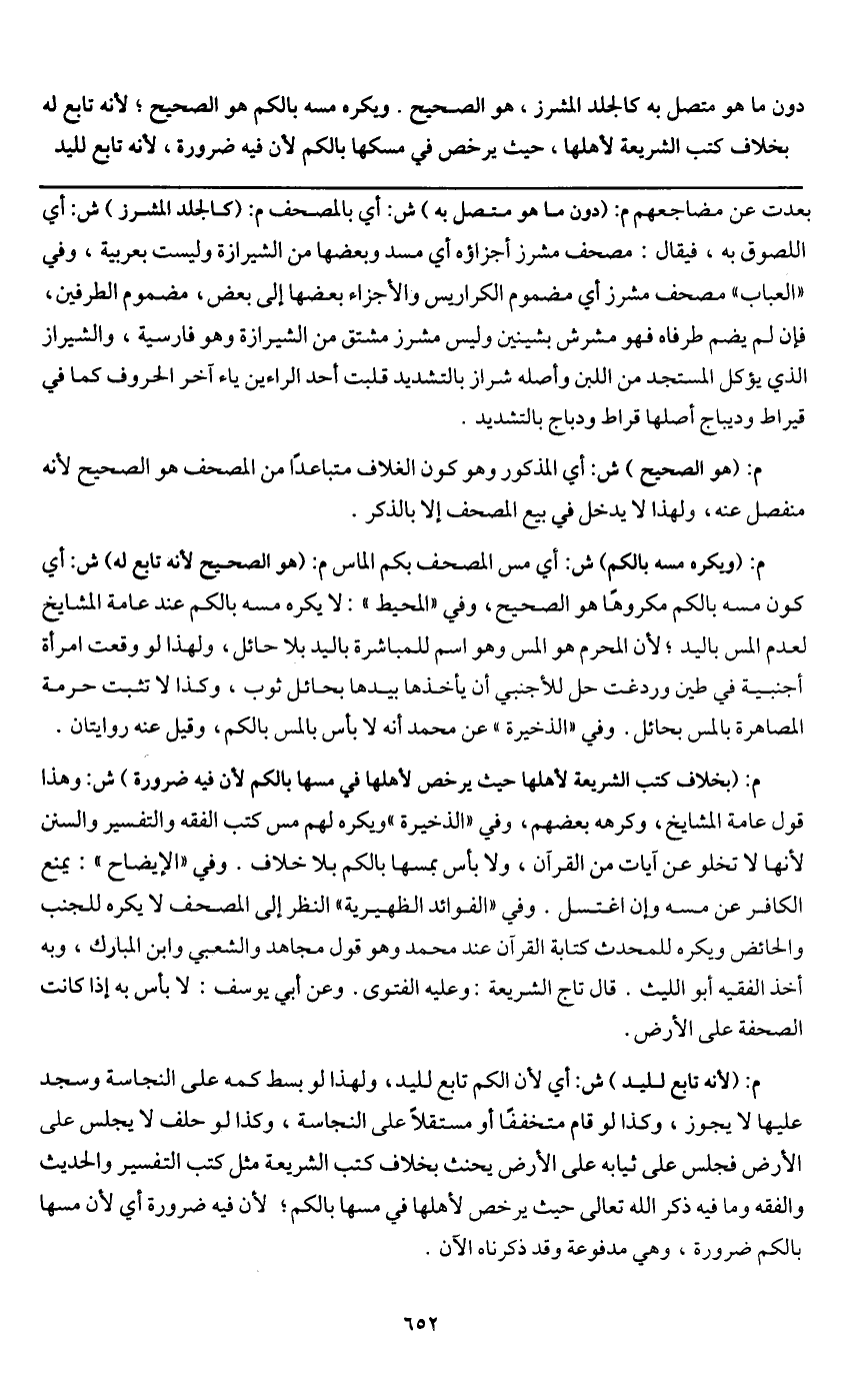ويكره مسه بالكم هو الصحيح؛ لأنه تابع له بخلاف كتب الشريعة لأهلها، حيث يرخص في مسكها بالكم لأن فيه ضرورة، لأنه تابع لليد