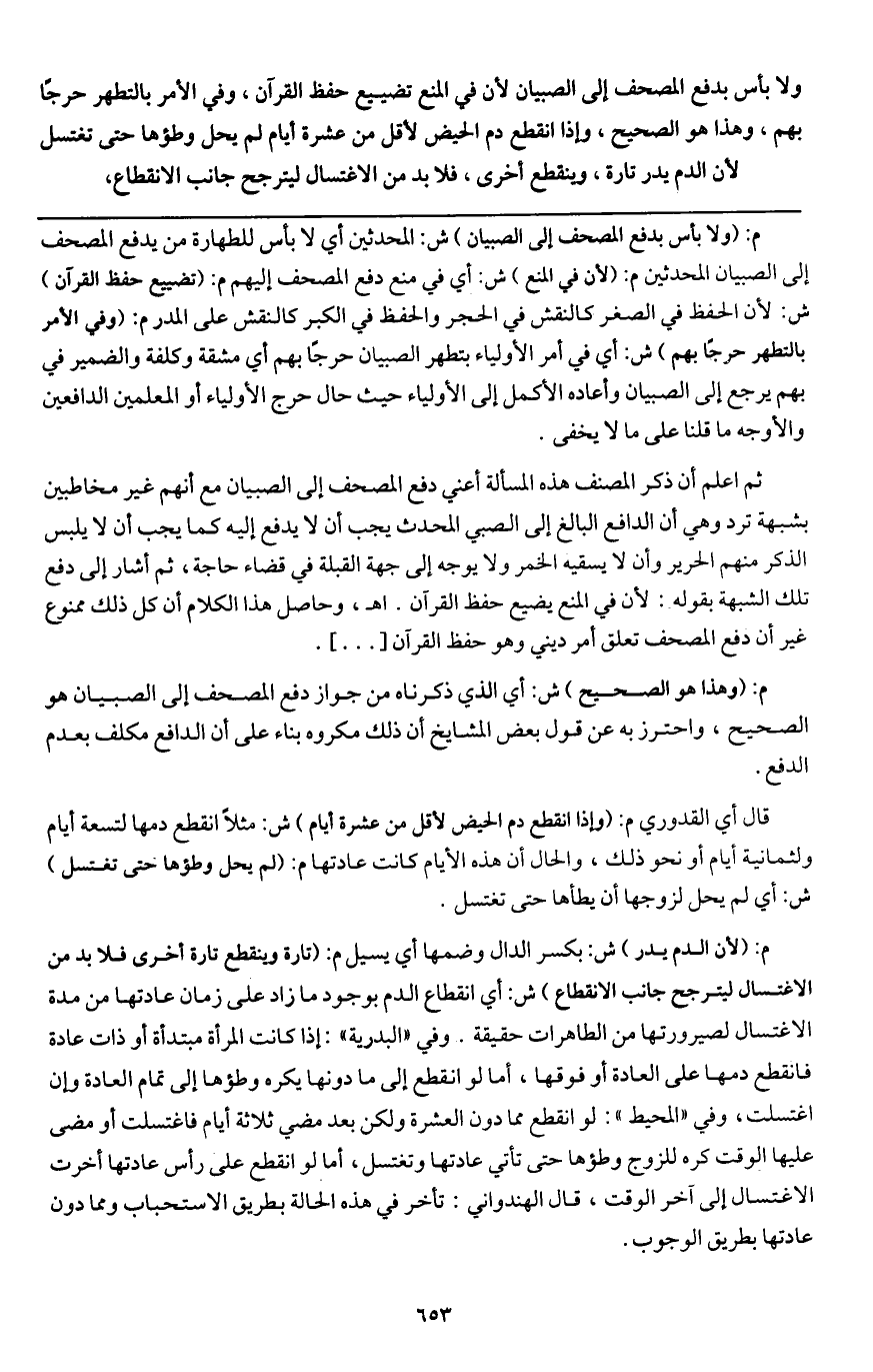 ولا بأس بدفع المصحف إلى الصبيان لأن في المنع تضييع حفظ القرآن، وفي الأمر بالتطهر حرجا بهم، وهذا هو الصحيح،